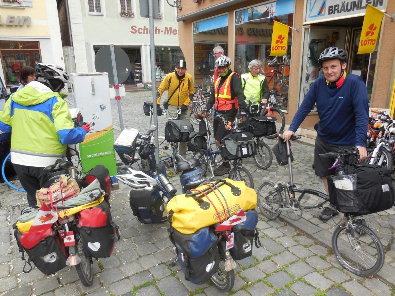 Outside the store we ran in to five (at least) guys, who were touring with 16" Bromptons. They were French and German, and had met each other and organized the tour through a Brompton users' forum. We really wanted to get to Dinkelsbuhl, and so did not take the time to analyse which models they were using, or to give them the usual grilling all about their tour. We did learn that they had started near the Bodensee and were heading for Wurzburg.