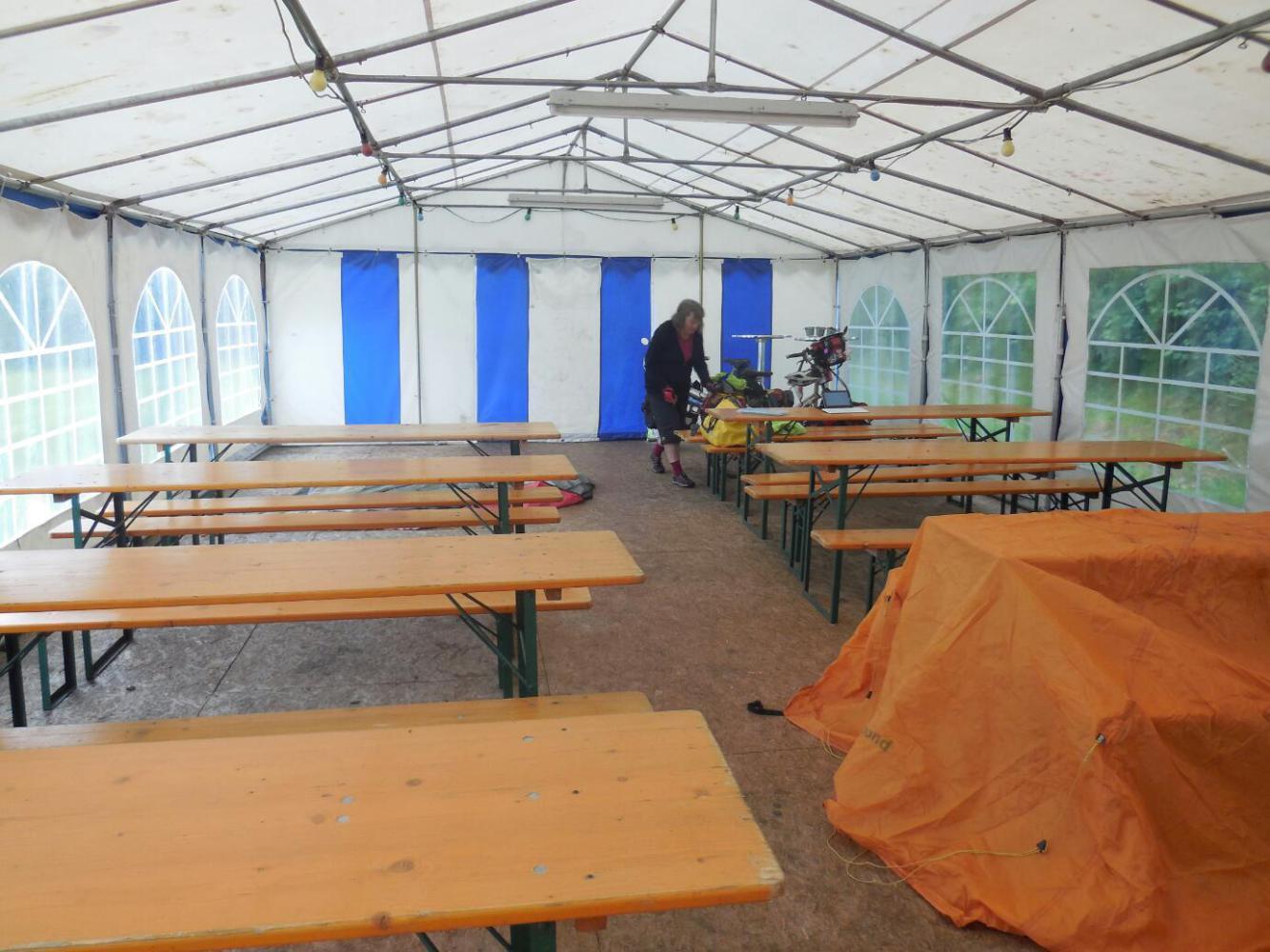 The camping is the standard luxury affair - by a lake, with a restaurant. The tent place is a large lawn by the lake, with picnic tables. However, we have gone one step further and stuck our tent in our favourite spot - the table filled giant beer tent. No morning dew for us.