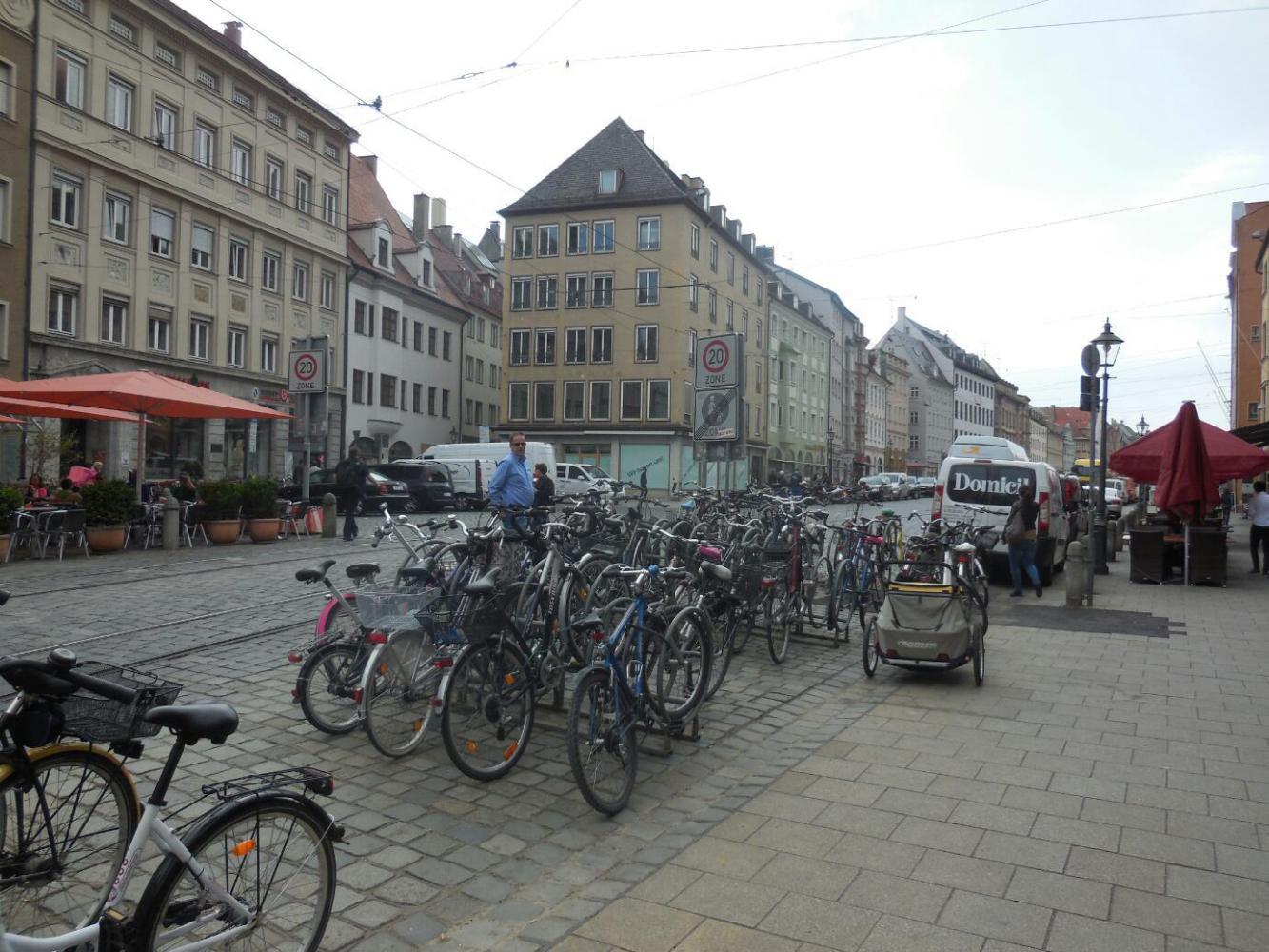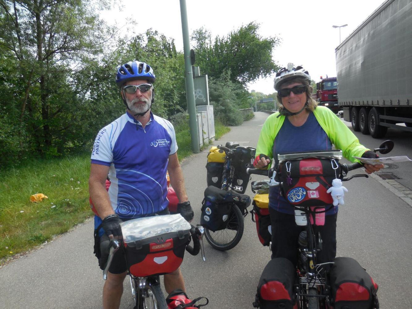 Some muesli mixed with yogurt got us started out of the campground. Merv's tent was beside ours, and we all packed up and left together.Our plan was to go into Augsburg for a look around together, and then free Merv to carry on at his own speed. However we expected to meet up with him again, either at the camping in Landsberg or at Fussen.