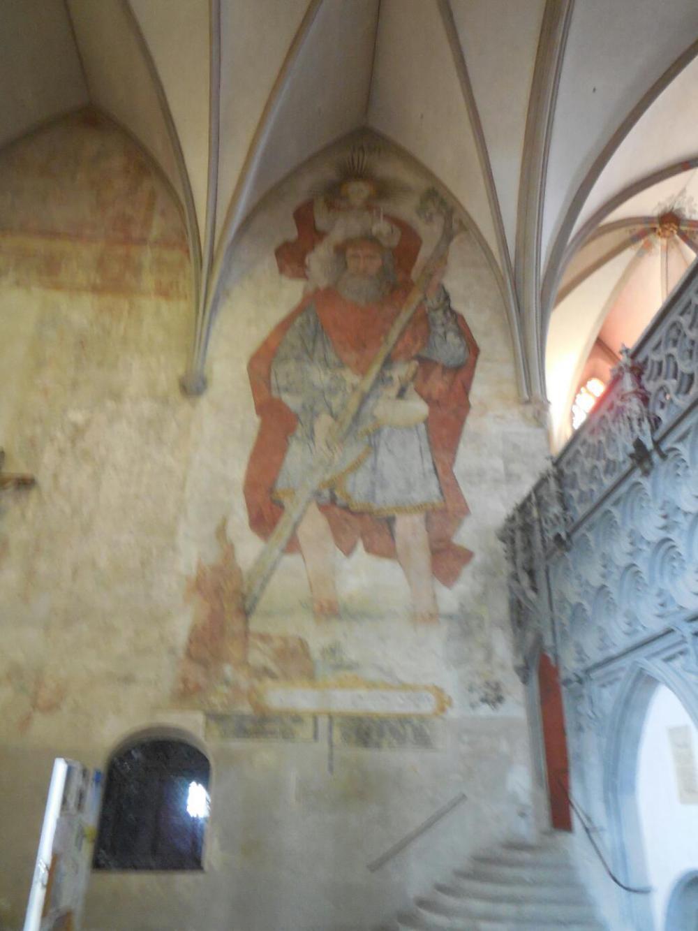 Since we remain tourists, of course, our focus was first on the Augsburg Dom. With temporarily three in our party, we were able to have Merv out with the bikes while Dodie and I went in together, then we watched Merv's bike while he went in. The Dom had once been decorated in Baroque style, but it was pretty much all converted to Gothic in the 19th century. One element of decoration that we have not seen much before was a fresco, showing St. Christopher, that dates from 1491. Otherwise, though there was naturally lots of amazing art and carving, nothing really caught our attention. Dodie does like this spare style of church, though. I however am a fan of pink cherubs and lots of gold trim. As we pass into more Catholic areas, I will be seeing a lot more of that.