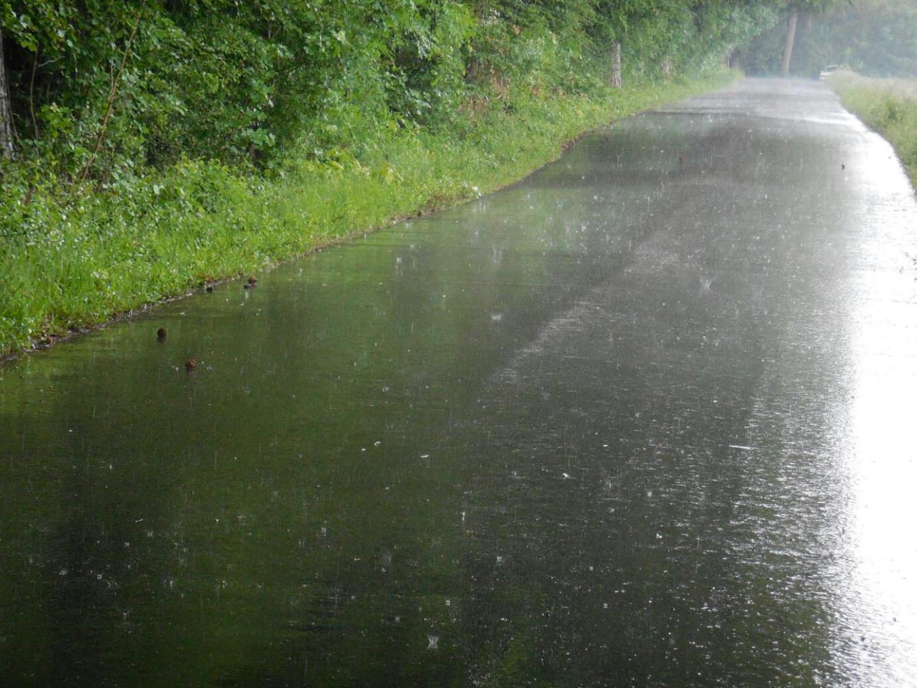 More thunder signalled time to get out our nice dry gear and put it on again. The temperature dropped rapidly from 18 to 10, the wind picked up, and the sky opened. At this time we were not far from the major town of Landsberg, and had been heading for the camping.