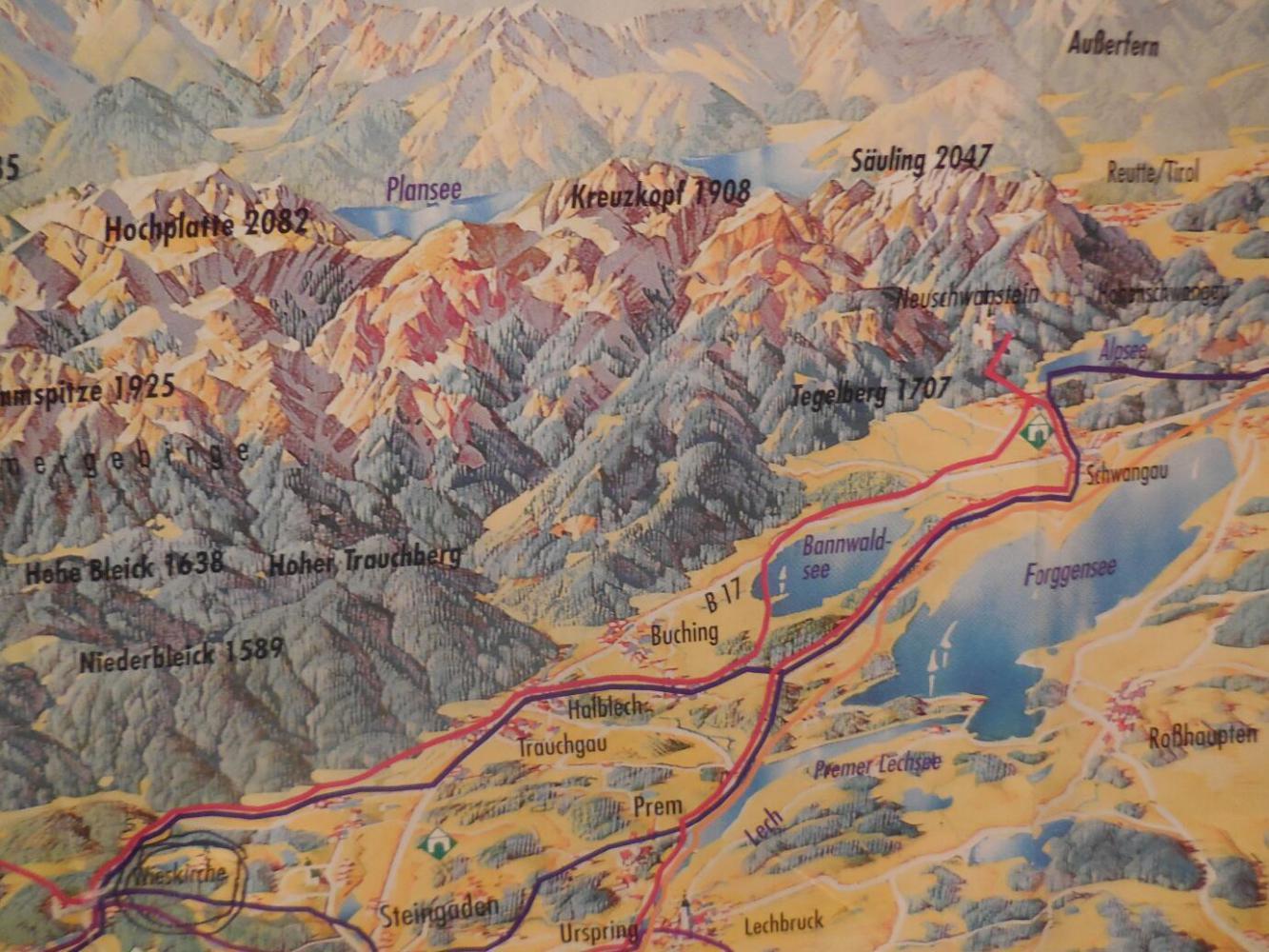 We have now drawn our little expedition almost up against the wall of the Alps. The handout maps that you get in this area have the south at the top, because that is the wall of the Alps. Our plan is to continue tomorrow the short distance to Fussen, which is at the foot of the mountains. We will stick there for a bit, and go see Neuschwanstein, which is the famous white castle of mad King Ludwig II. We will then skirt along the face of the mountains and finally dive in, making our way to Garmish-Partenkirchen. From there... hey, stay tuned and follow it all, right here!