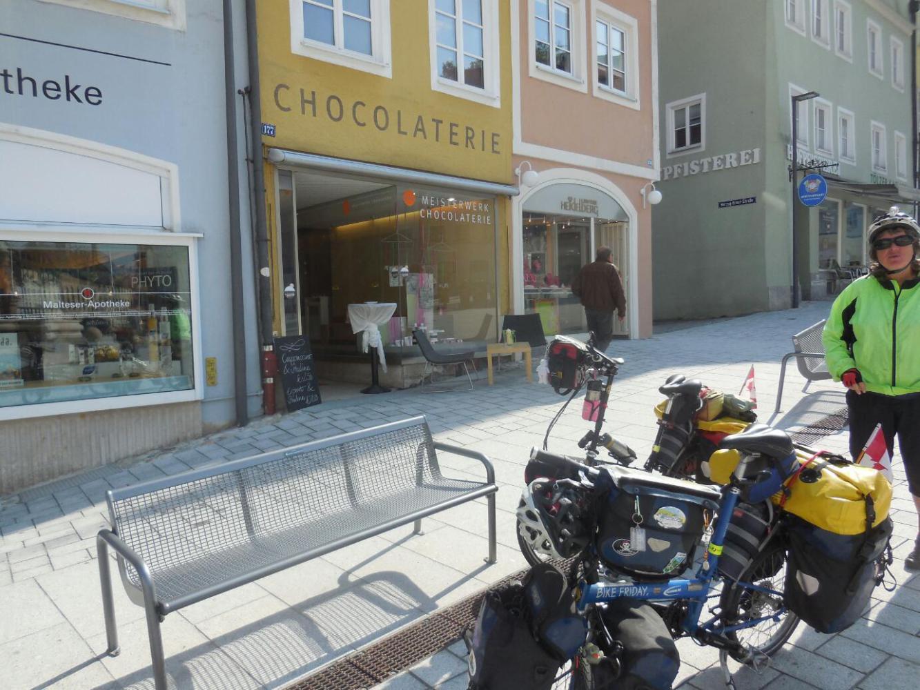 Anyway, it worked out, and Dodie was up and running with a track for the Via Claudia onscreen in front of her. Before leaving on this new thing, however, we found that the strain of the surgery (not to mention the baleful hotel guy and his mother) had sapped our strength. So we popped into the chocolate shop opposite where we were sitting and had them make us two hot chocolates. Also bought six of their chocolates, which they were making on site. When ready, they carried our mugs out to us - right in the public square where we were sitting. Nice. I also went in and (this time) asked if I could snap a shot of some of the chocolates. "Well of course!" came the proper reply.