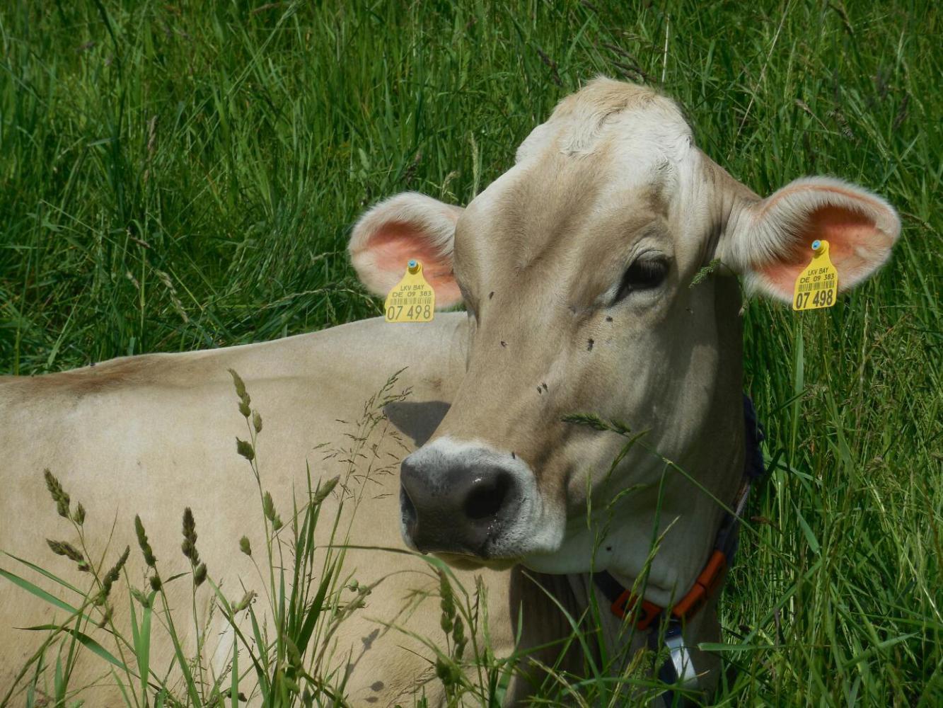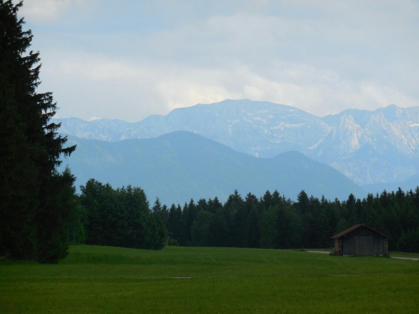 Now we come to the bit that always seems surprising on a bike. The bike (especially ours) seems to move rather slowly - but if you blink for a few seconds (ok, hours) you can find that you have been transported into an entirely different world. We expected that to happen at this stage, because we know we are headed for the Alps. But it did seem that we blinked and suddenly the fields of corn or oats became the "Alm" - upland meadows. The cows, which had actually been not much around anyway, became more numerous and many of them were "Swiss style" ones. Many also wore bells, making a very musical tinkling. Finally, we looked up and ... there were the mountains! The Lech had suddenly changed as well - now it had the turquoise tint of a mountain stream.