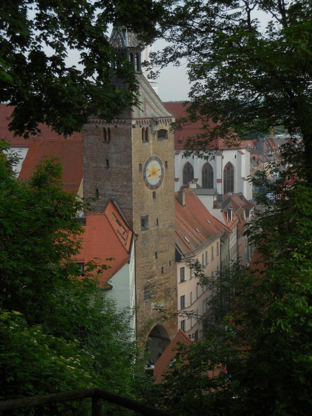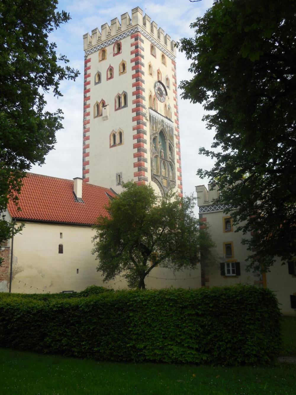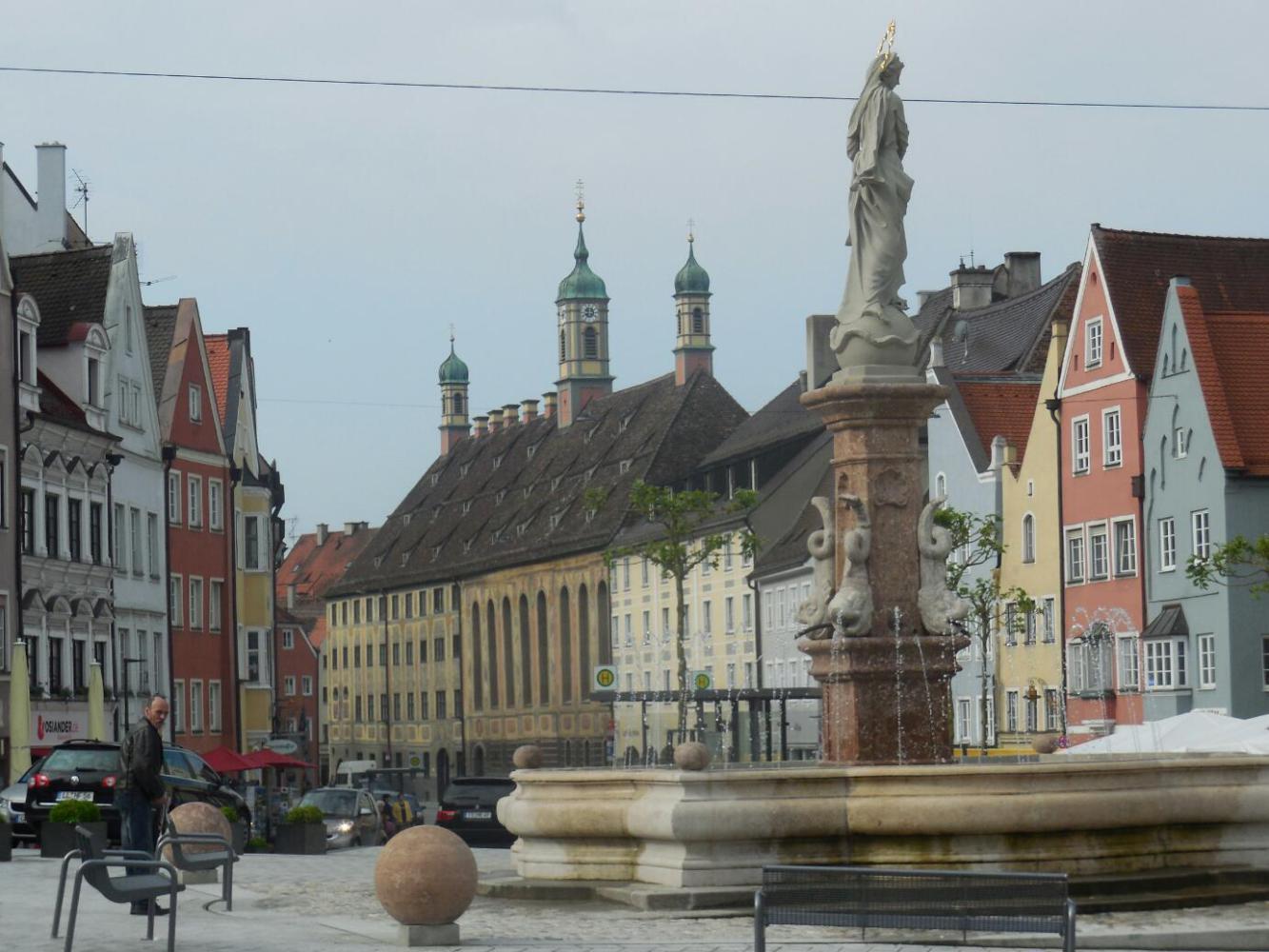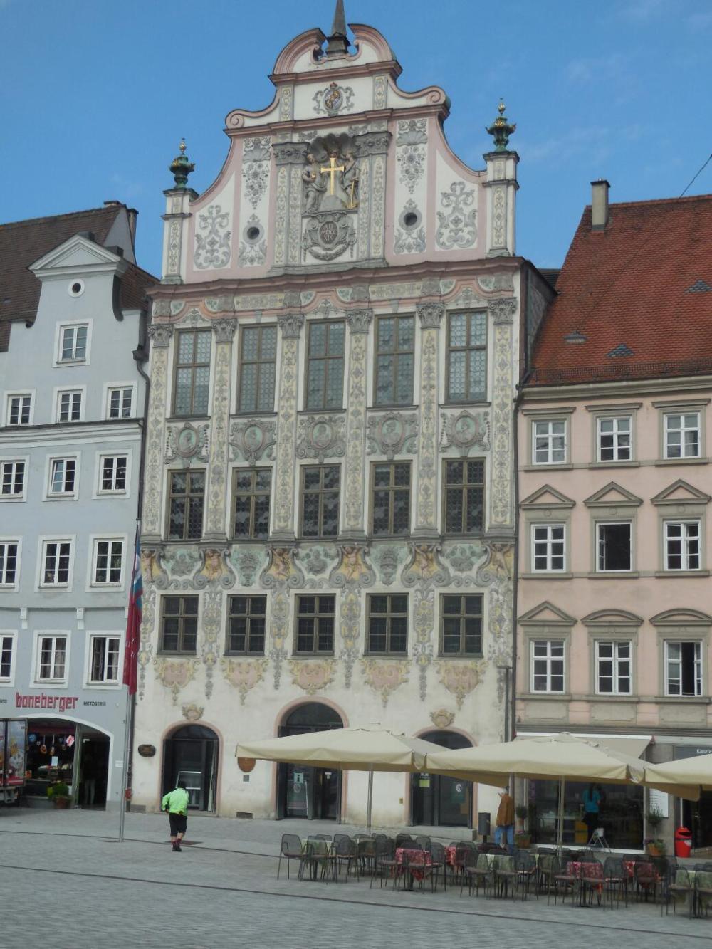 The town of Landsberg is built on a hill above the Lech river, and our hotel was near the top. There is entrusting stuff to look at as one would proceed down the hill, but we seemed to get locked in by walls and steps, so that when we finally came to the interesting bits we were mostly down the hill from them. However, we did land in the Rathaus square. This was a proper rathaus square, the way we have come to understand it. First off, there are three bakeries minimum around it, then the rathaus, and a church.