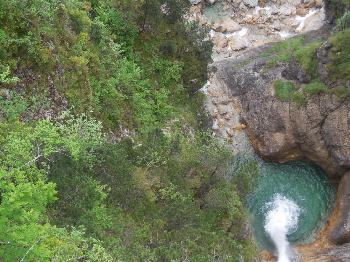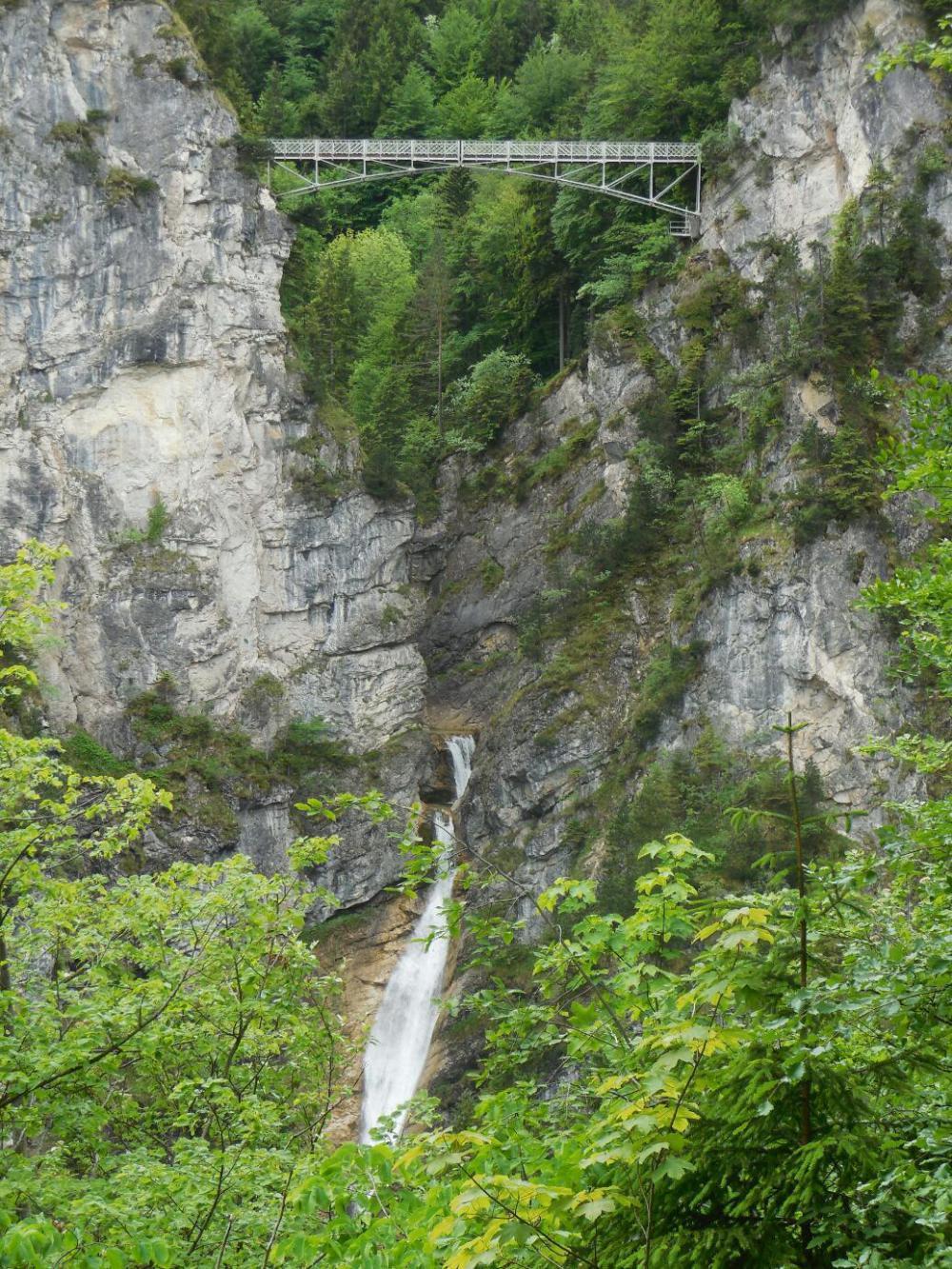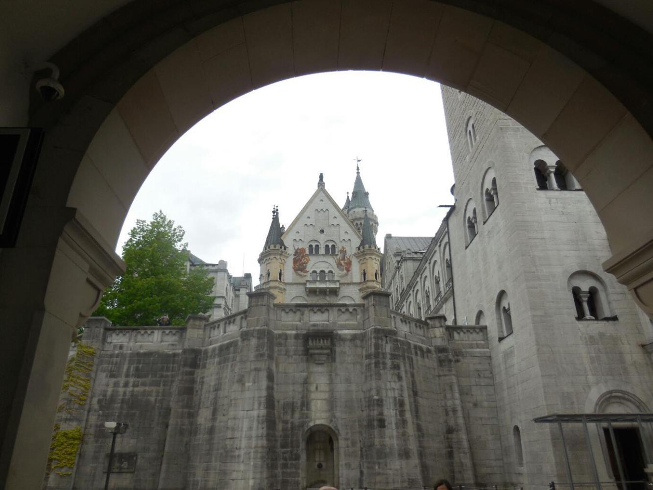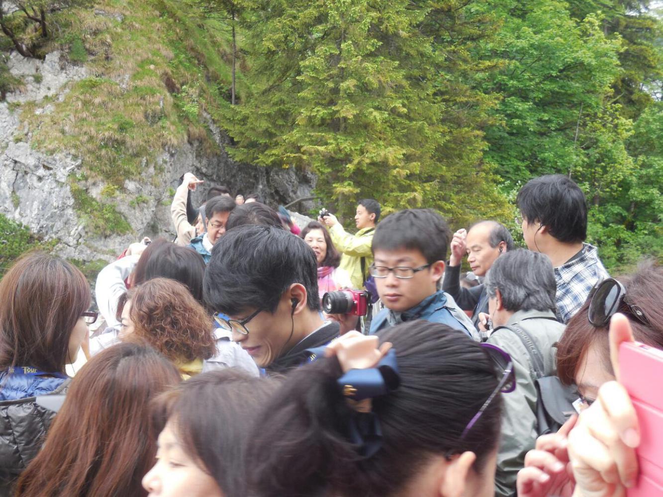 Using our advance info from Rick Steves, from the shuttle we headed not to the castle, but first to the Marien Brucke - Queen Mary's Bridge. This crossed a narrow gorge above the castle, and gives a magnificent view of both the castle and the valley below. It was a bit shocking when we stepped out onto the bridge, because it is narrow, and the gorge deep. We grabbed each other's hands and hung on. This was a good thing, because now a goodly portion of our Chinese friends from the bus piled onto the bridge too. The bridge deck boards were wiggly, the bridge swayed, and we also felt like we could be swept overboard by the human wave alone. Still, we clung in there, and I hope got some good shots.