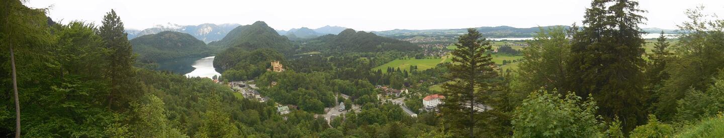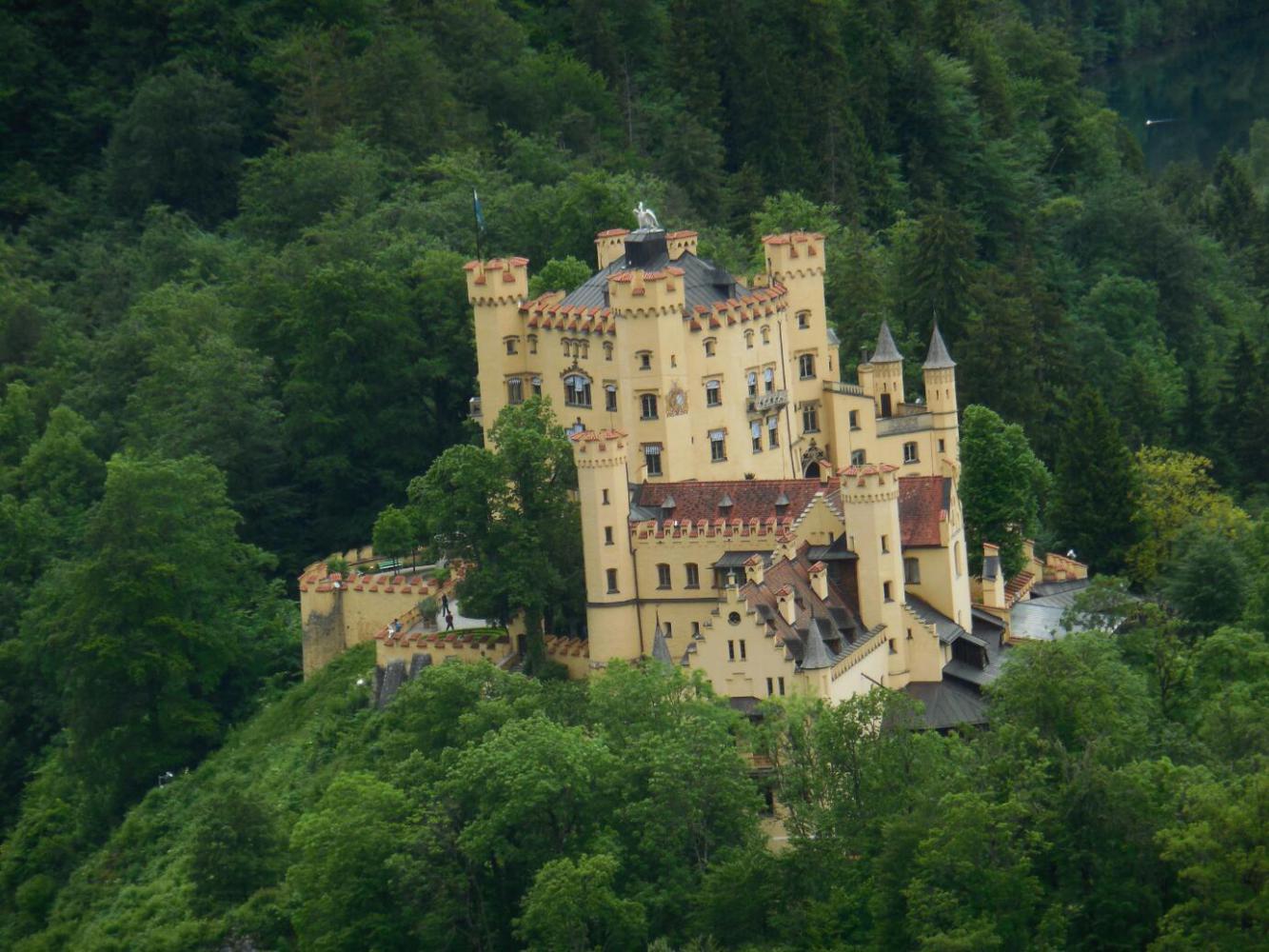 This was our day for over the top castles and churches. Fussen is just a few km from Schwangau, a small town standing to the east on a small lake called the Alpsee. Schwangau is really at the foot of the mountains and the Tirol. Just above the town are two castles. The first is Hohenschwangau, which dates from the 12th century. In recent history, it was restored by king Maximilian II, in 1832-36. The restoration involved famous artists of the Romantic epoch, and today it has 14 rooms of sumptuous German Romanesque style.