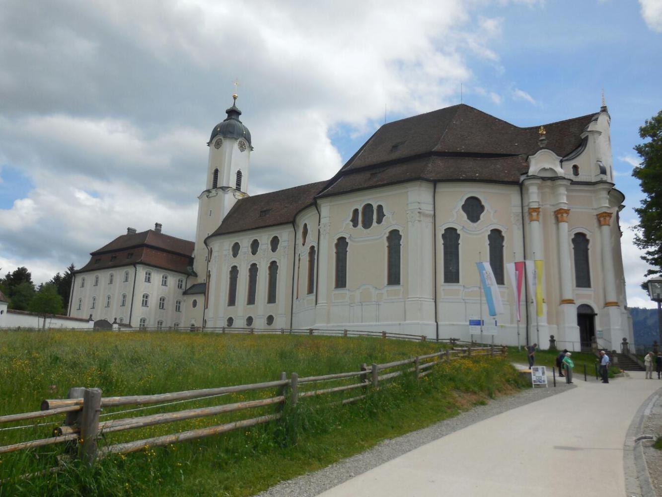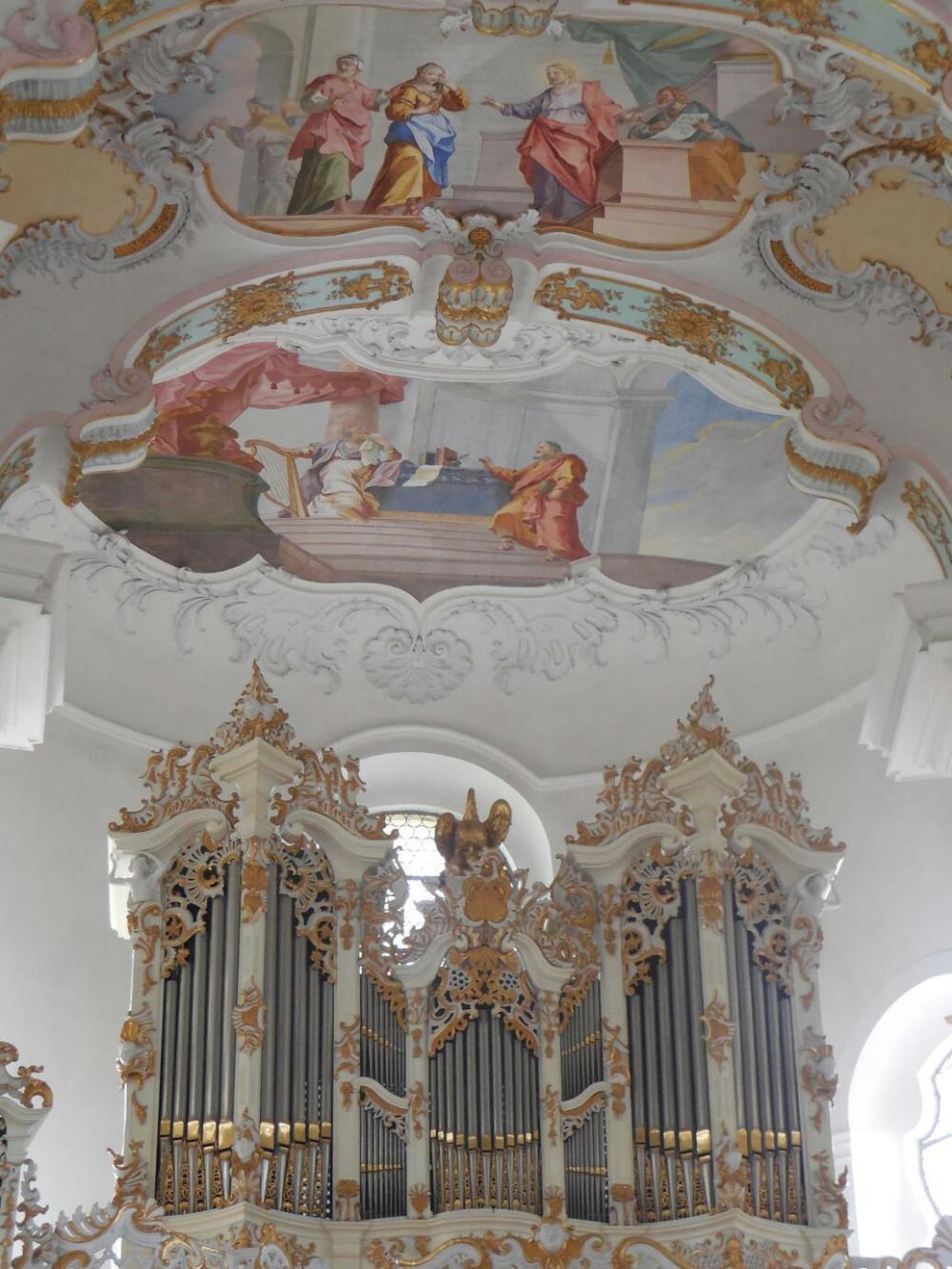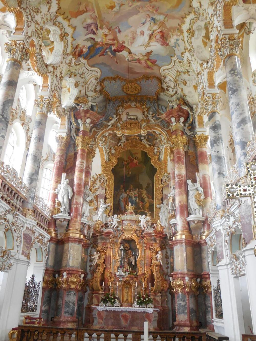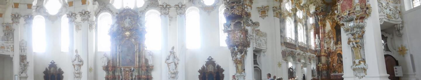Sandra had alerted us to the existence of the Wieskirche, a Rococco church about 25 km from Schwangau. So we used our bus pass and hopped on what turned out to be the same line number that had brought us from Fussen (number 73) for the 40 minute ride out there. We only had about 40 minutes before the last bus back home to Fussen, but that proved just enough to absorb what the church was about.