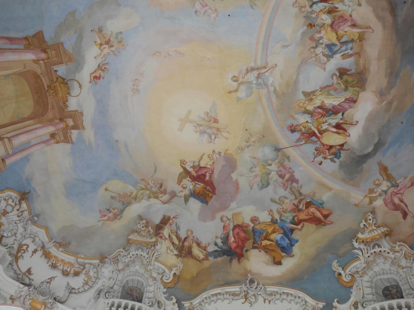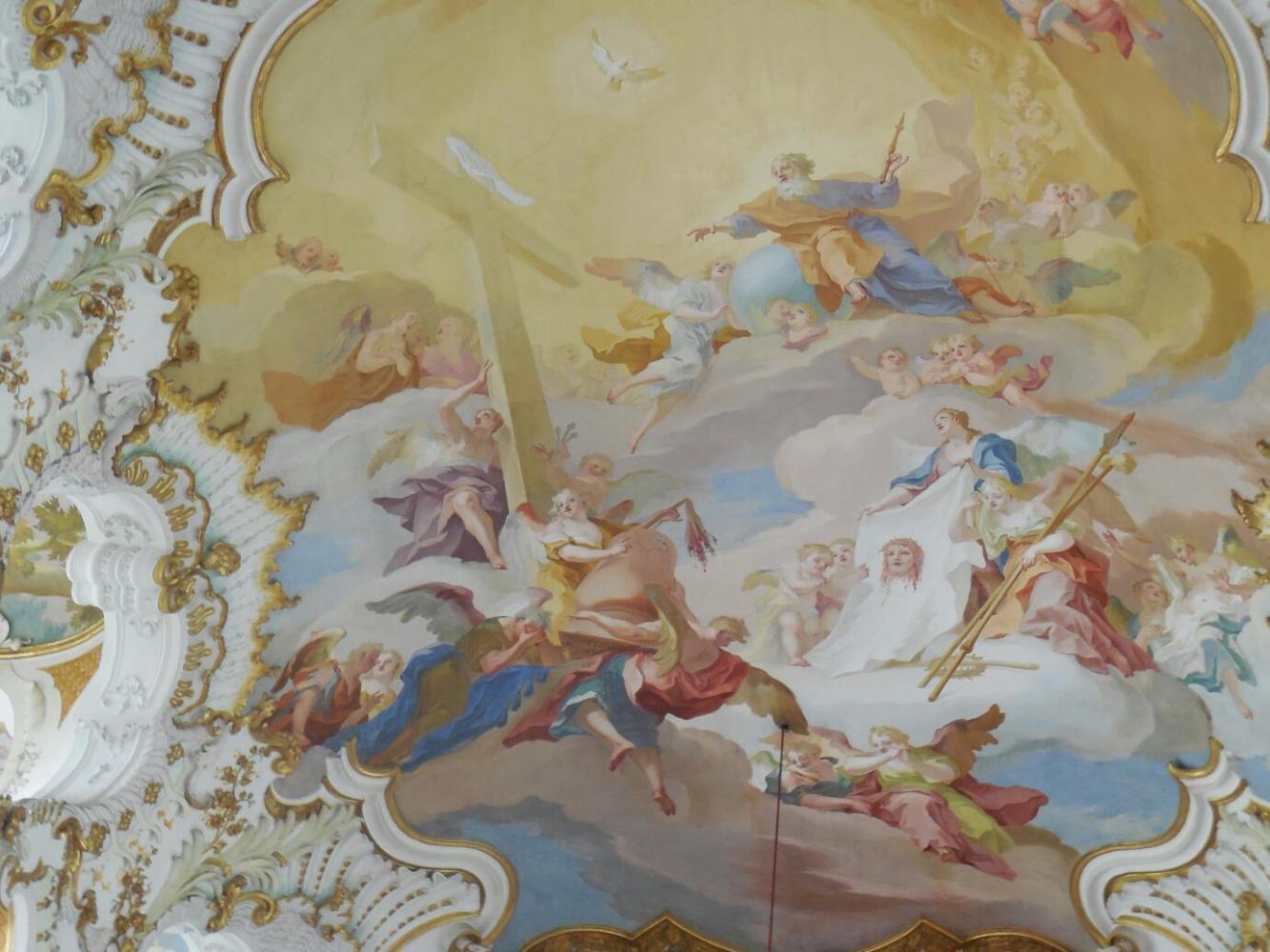 Part two of the story is the style of the church. It is over the top Rococco. That means swarms of cherubs, gold trim, and painted ceilings. There is a lot of red - symbolizing Christ's blood, and blue, symbolizing God's love. There are gates to eternity, scenes of healing, Samaritans, tax collectors, etc. etc. It's a beautiful comic book - sharing something in that respect with Neuschwanstein. The priest and curator of the Wies writes in the guidebook that "Through its duality of art and theology this church holds a great spiritual strength...". I also liked it because they allowed photos!
