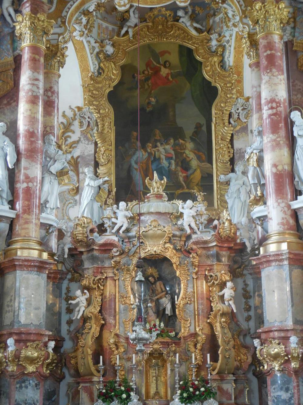 What is was about was two things. Firstly, in 1738 an image of a bloodied Jesus that had come to be kept in a private house, was reported to have shed tears. The Jesus became a pilgrimage destination, and was housed in a small chapel of the "Scourged Saviour". Pilgrimage traffic became so large that a church was built to house the figure. "Wies" means "meadow" and since the chapel had been in a meadow, and anyway the new church was right beside in the same meadow, the church was the Wies Church.