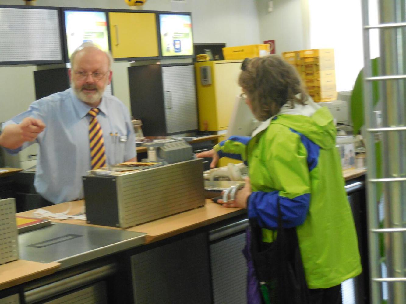 Dodie and the nice man at the post office, as we prepare packages of souvenirs to send home and not be dragging on the bikes.
