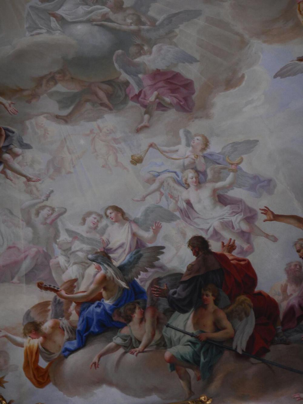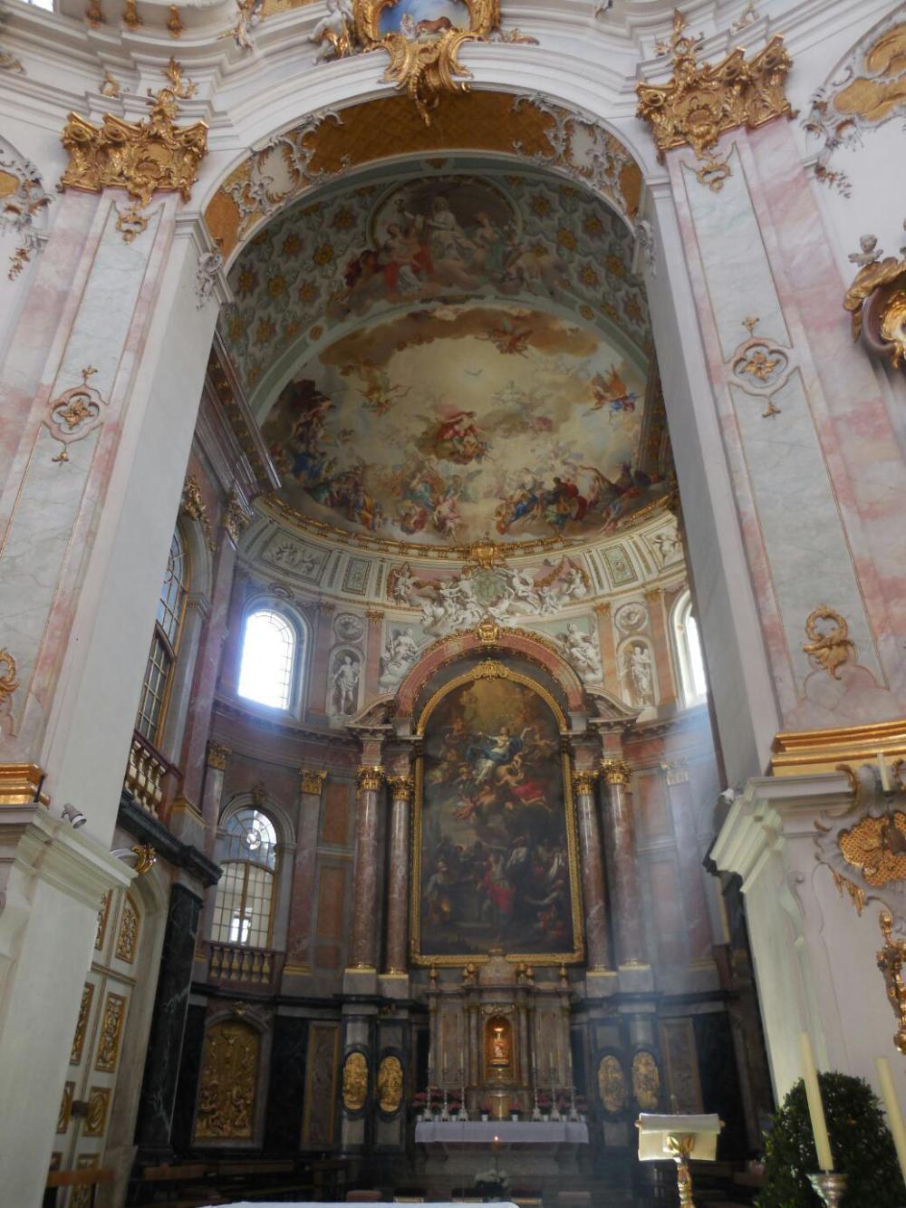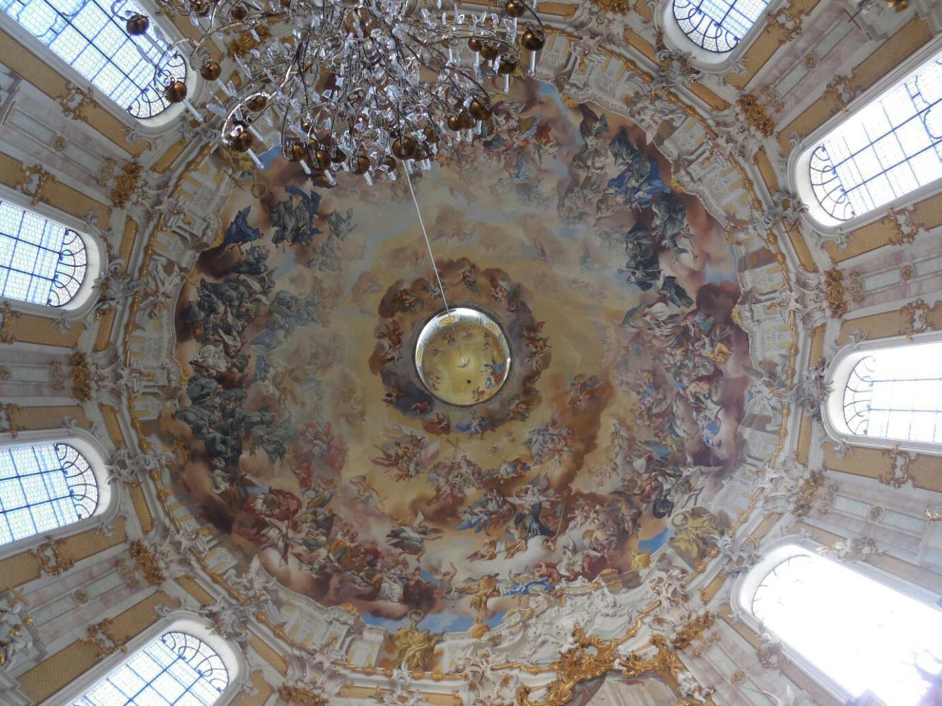 The interior of the basilica looks like the customary south German baroque extravaganza. It has cherubs, lots of gold, and large ceiling paintings, with hundreds of figures. We actually forgot to look for the famous madonna while inside. It is said to be very small, in comparison to all this other stuff.