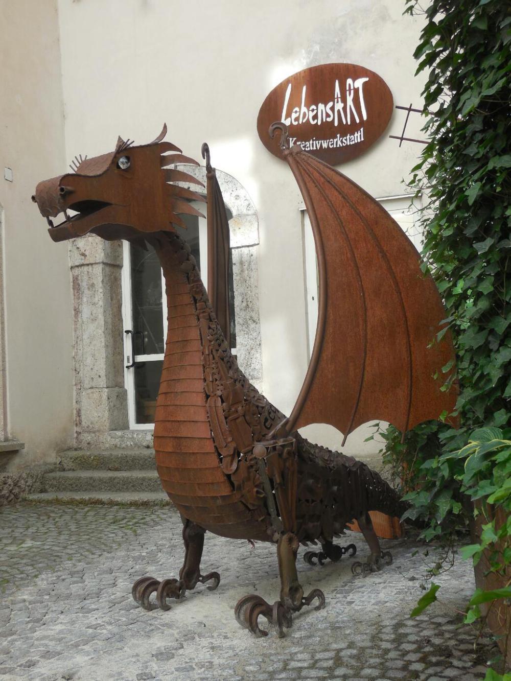 Our final lady seemed to pull over in her car to ask us the UQs, but eventually were on our way. It didn't last too long, really, because at Wattens Dodie noticed a large factory with the name of Swarovski. She recognized this as the maker of fine crystal. So when we came around to their Kristallwelten (Crystal World) attraction, we went in for a look. At 11 euros each, it was pricey. So what was it? What is was not was an explanation of what crystal is, why the factory is here, and how they do it. What it was was a highly "arty" series of installations that made use of crystal in some way, while delivering artful interpretations of life with elaborate use of light, sound, and costume design. It would take someone who really knew about modern art forms to better say what this all was. But just for one example, in a darkened room a female formed soet of robot walked mechanically but gracefully around a track, while overhead a male form comprised of a dozen parts on rods disassembles and then reassembles, shaking itself realistically once fully reassembled. Meanwhile brightly lit shirts on an overhead track dance and jiggle around the room.... and so forth.