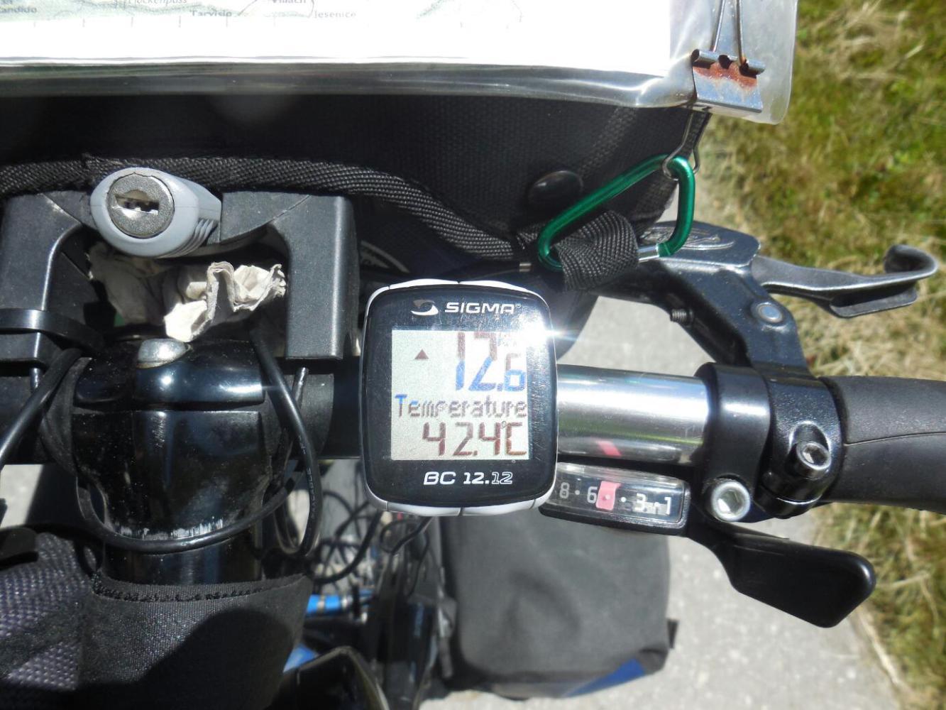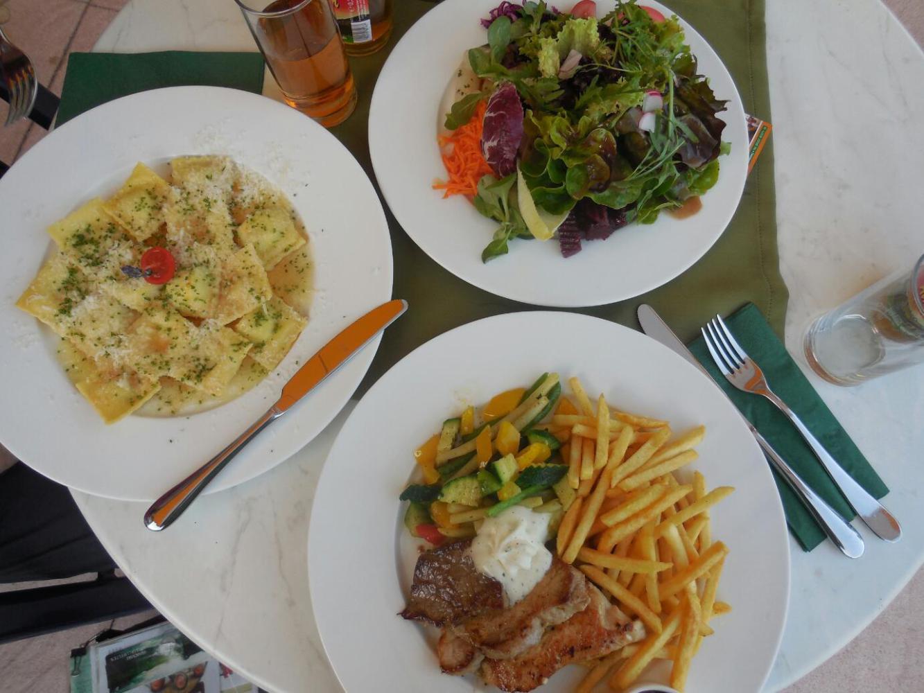 We finally followed the GPS and the Bikeline map up to a camping at a little lake quite high above the river. The temperature had been in the vicinity of 40 for most of the day, so we were beat. Also since it was Sunday, we had not found enough to eat. The push up to the camping, then, really made us tired. Fortunately, as is common, there was a restaurant. So we decided not to cook our noodles, and instead got a terrific tasty and healthy meal. This we ate on a terrace looking out to the mountains.