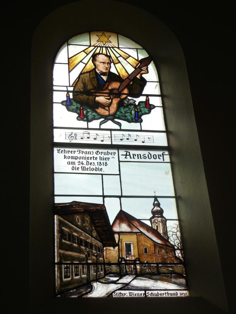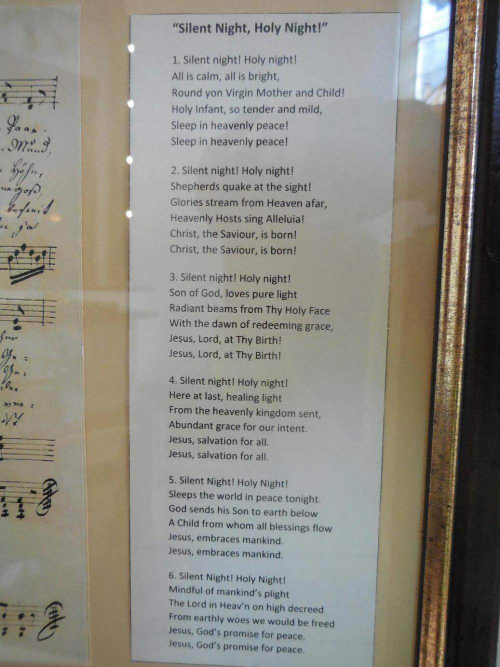 The full text in English. There are more verses than we usually hear. The German version seems quite a bit different, so whoever did the English had to adjust a lot. There is a CD in the gift shop with versions in 15 languages.