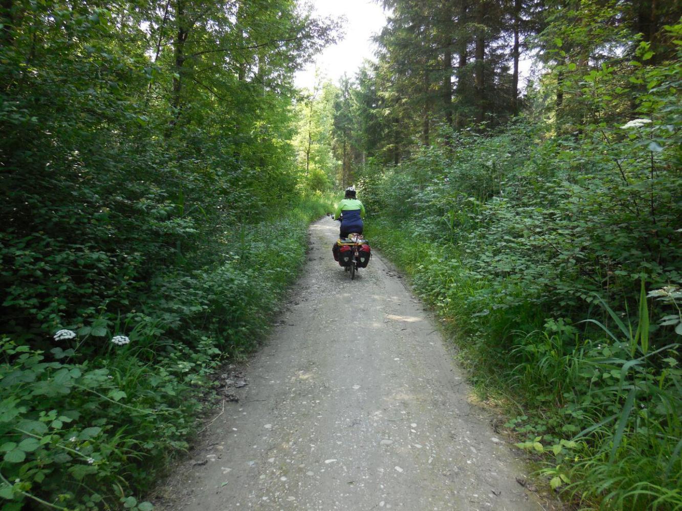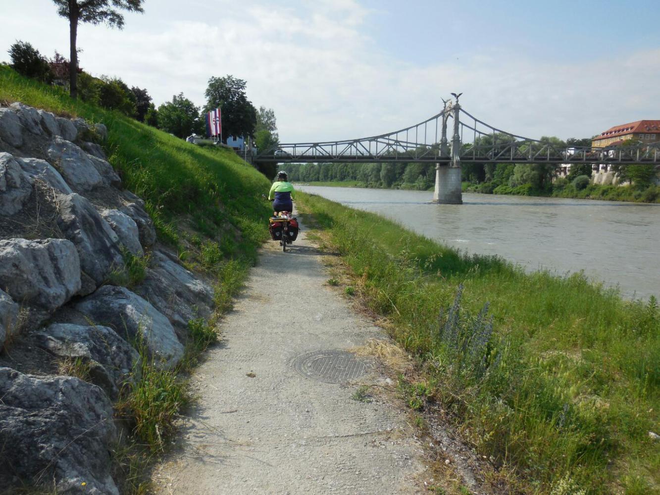 We returned to the river, since as experts we knew we had only to follow it down to Salzburg. But this is where I said "Gee, last time when we left the chapel we headed "inland", wonder why". "Dunno, anyway we know our way around better now", we told ourselves. So we sailed down, past the bridge, until a sign pointed the way inland. Pshaw! We plowed on, until we hit a gate. Gotta be a way around this - said the experts. so we backtracked a bit. Still no luck. We backtracked more. We backtracked almost all the way back to the chapel - it looked like the guestbook wish was going to come true much sooner than predicted! Finally we found a dirt track under the bridge, and followed that until it became a rocky track for about 5 km, very near but not quite on the river. So in somewhere under twice the time it might have taken to "go inland" the experienced travellers were on their way to Salzburg.