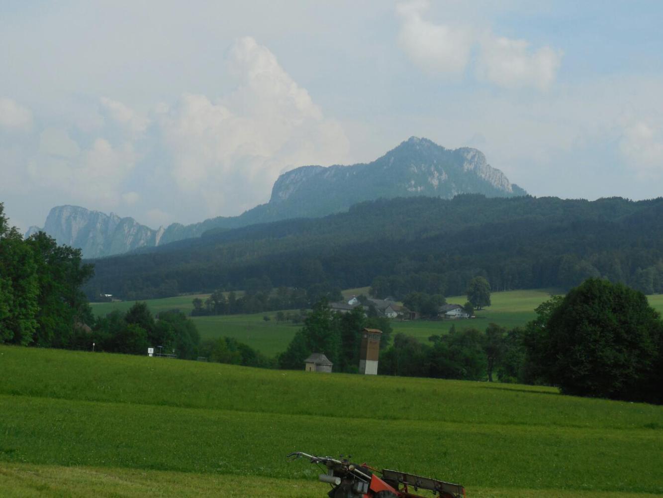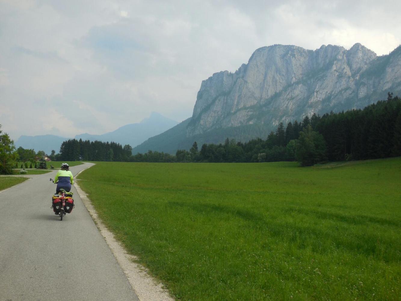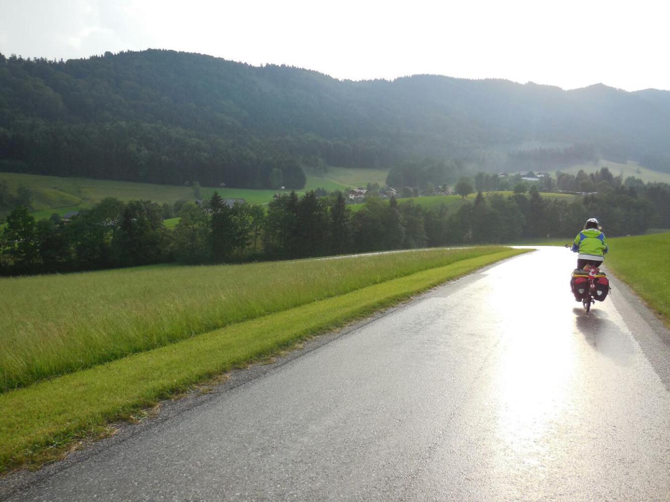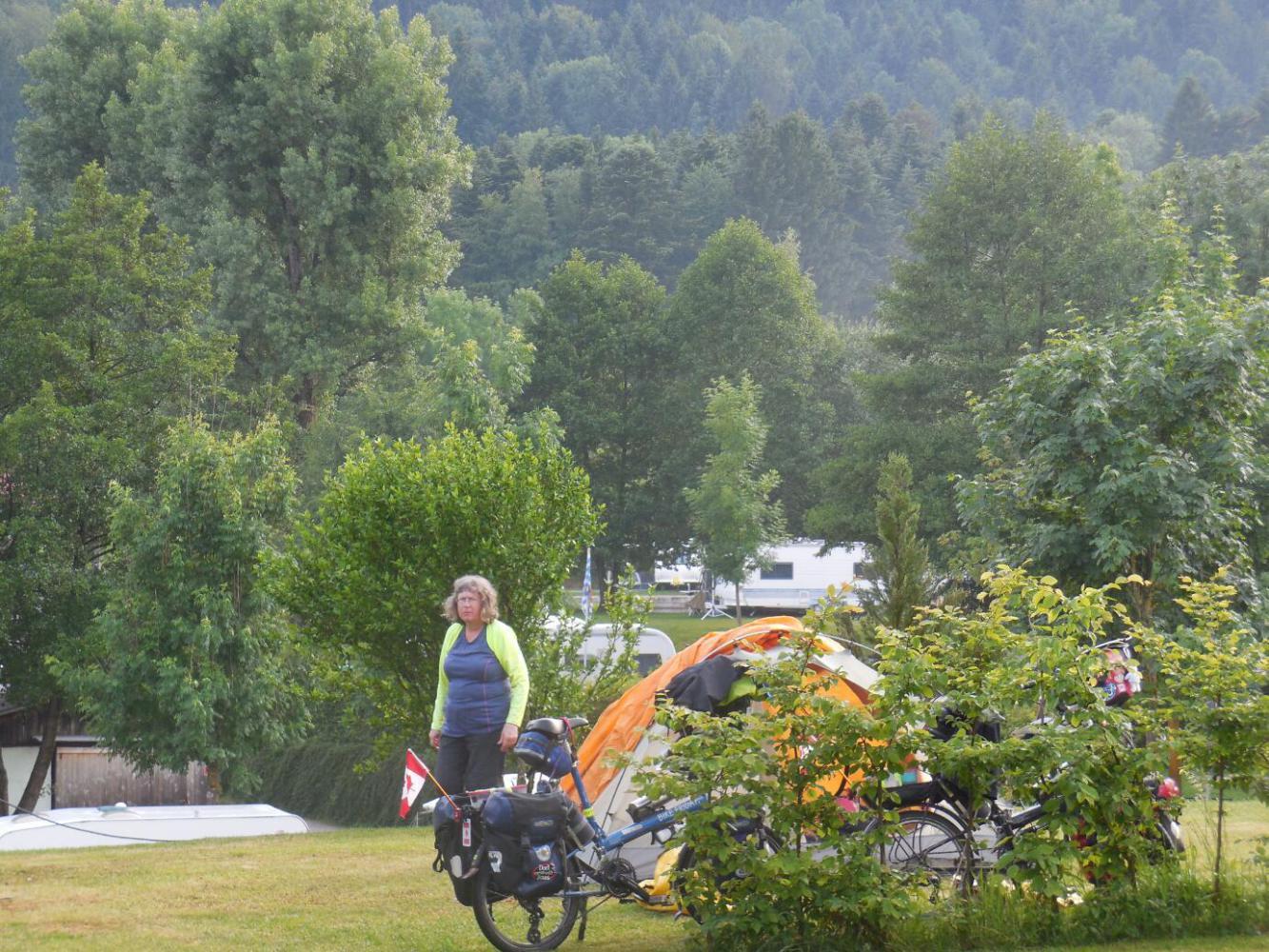 When the time came to find camping we followed the GPS, while passing all sorts of guest houses. There had been thunder in the mountains for a couple of hours, and some were obscured by rain (this included the back side of the Dachstein massif, which is visible from here). But having already gone into a guest house last night, we were determined to camp this time. The road lead up and down, but we were enticed onward by "Camping" signs. Finally some rain drops fell, and we stopped to put on our rain gear. We had stopped right in front of a Guest House - but this time we were not temped (enough). We pressed on. The sky opened. It actually started off with a bit of hail, just to set the mood, but soongot down to the kind of downpour that bounces the drops high off the pavement. Dodie is good at this. Zoom, she swished into a bus shelter. It turned out to be quite large, and we sat in there quite happily while the rain pelted. After a time it stopped, completely, and we emerged to continue our trek to the camping. We descended, and ascended, and then entered what I characterized as a "secret valley". It was clearly no secret, because it had scads of gorgeous houses, and indeed a Camping with scads of camper vans. No matter, it was a deep valley, surrounded by meadow slopes, and smelling of silage.