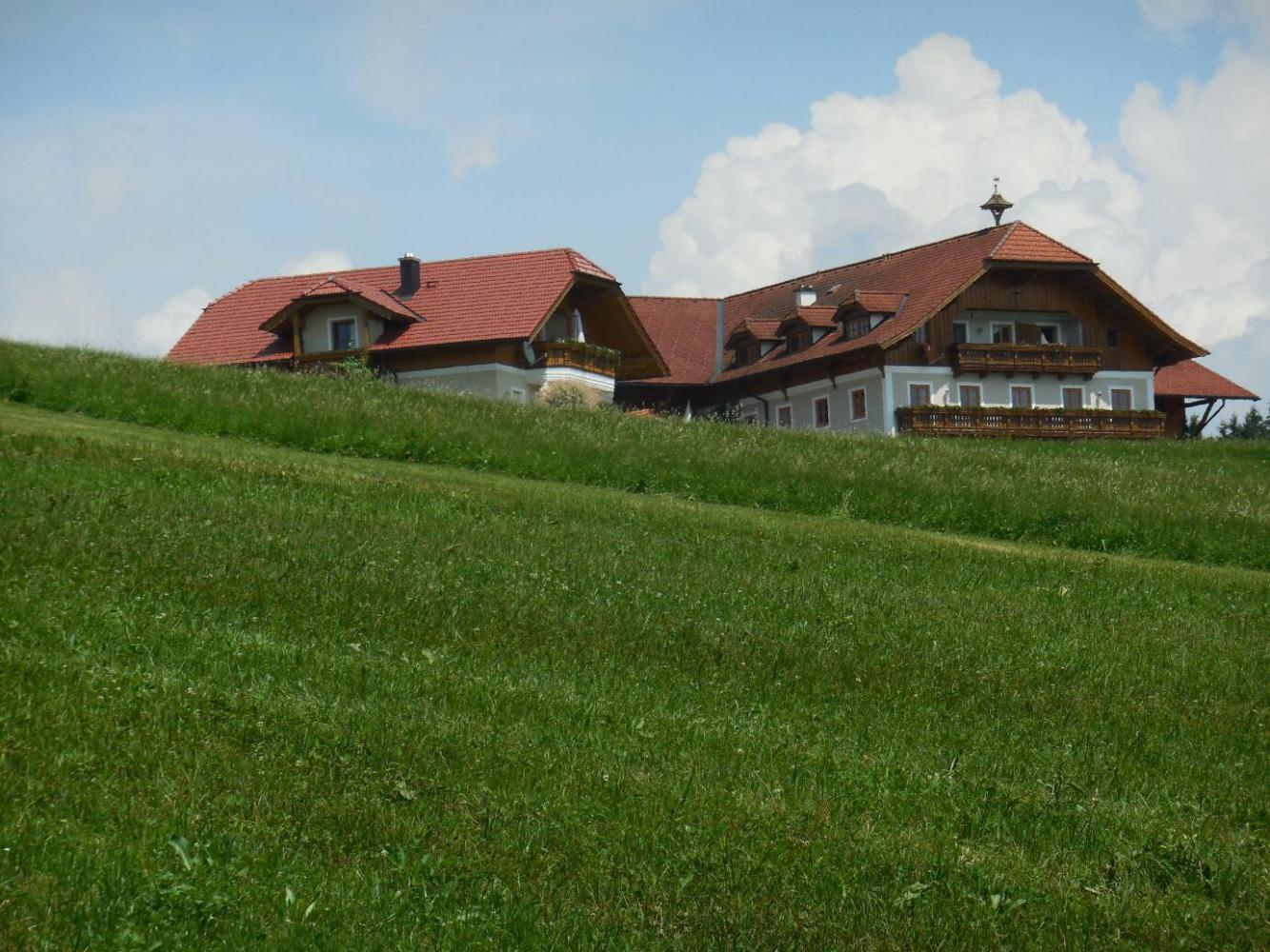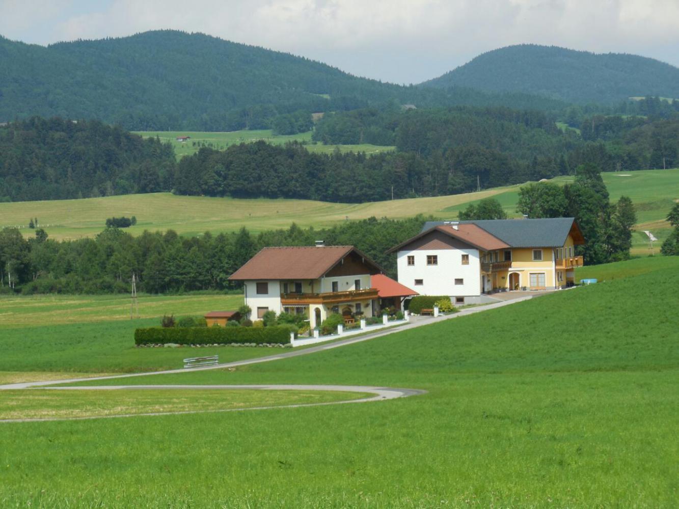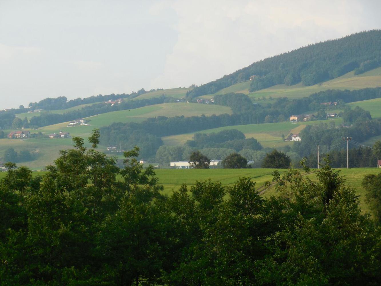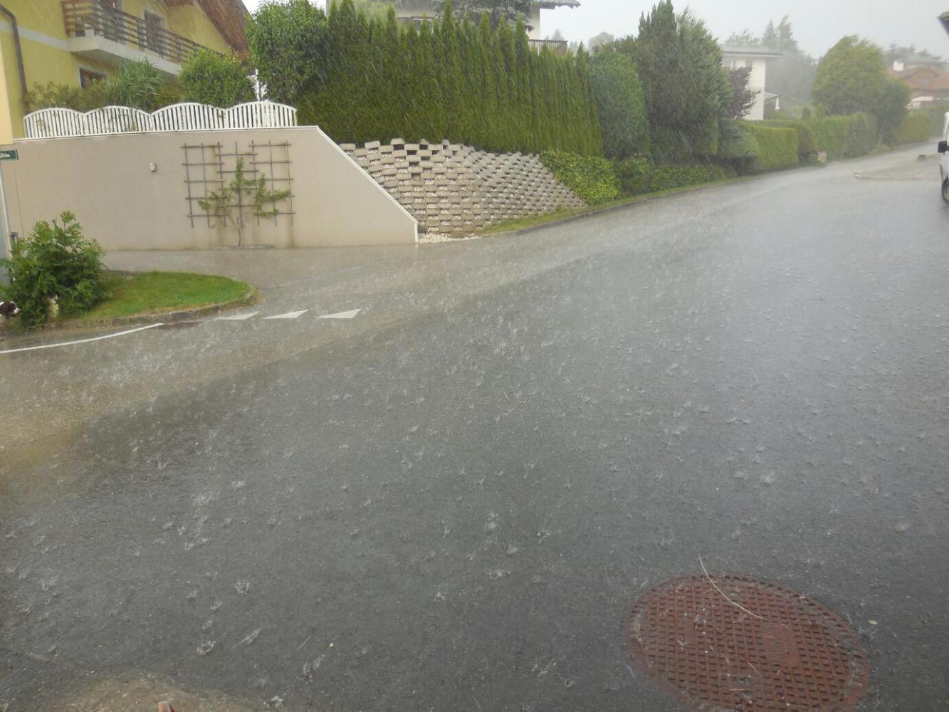 When the time came to find camping we followed the GPS, while passing all sorts of guest houses. There had been thunder in the mountains for a couple of hours, and some were obscured by rain (this included the back side of the Dachstein massif, which is visible from here). But having already gone into a guest house last night, we were determined to camp this time. The road lead up and down, but we were enticed onward by "Camping" signs. Finally some rain drops fell, and we stopped to put on our rain gear. We had stopped right in front of a Guest House - but this time we were not temped (enough). We pressed on. The sky opened. It actually started off with a bit of hail, just to set the mood, but soongot down to the kind of downpour that bounces the drops high off the pavement. Dodie is good at this. Zoom, she swished into a bus shelter. It turned out to be quite large, and we sat in there quite happily while the rain pelted. After a time it stopped, completely, and we emerged to continue our trek to the camping. We descended, and ascended, and then entered what I characterized as a "secret valley". It was clearly no secret, because it had scads of gorgeous houses, and indeed a Camping with scads of camper vans. No matter, it was a deep valley, surrounded by meadow slopes, and smelling of silage.
