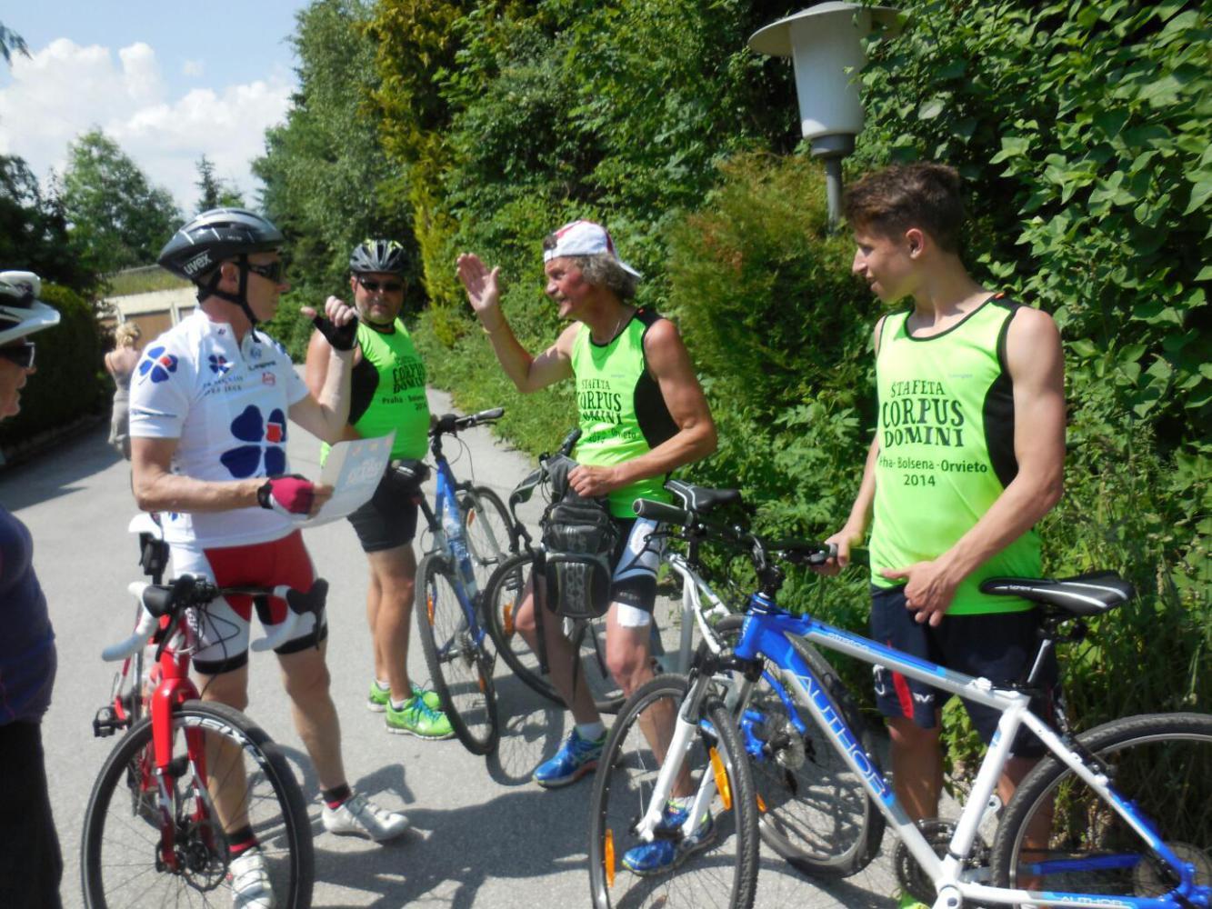 These guys are from Prague, and are in the middle of a three week run/cycle from Prague to Bolsena to Orvieto in Italy. It seems to be in honour of the 750th anniversary of something involving "Corpus Domini" and Priest Petr. Whatever they are doing, they have a backup van carrying all their stuff, so hmmm.