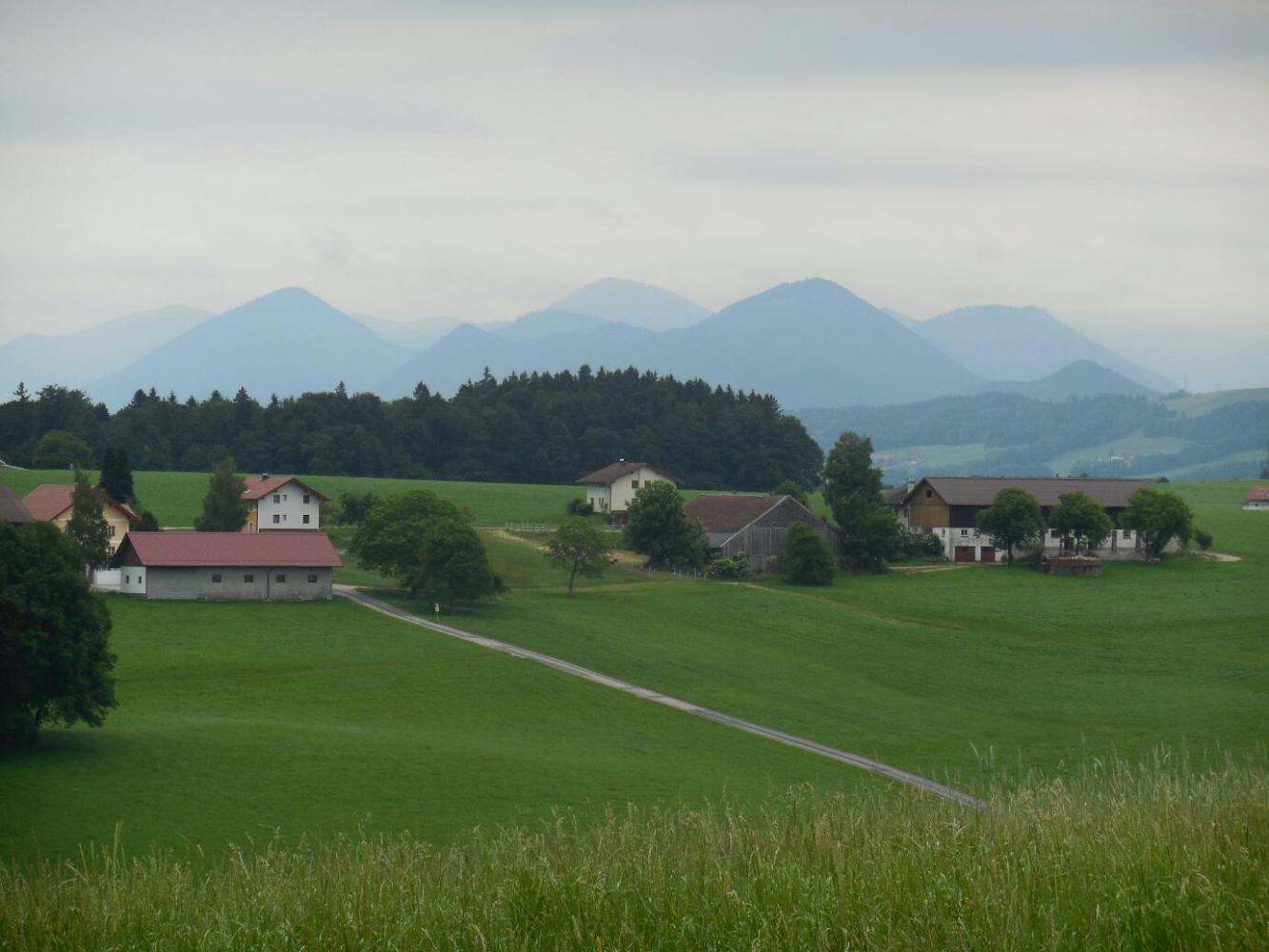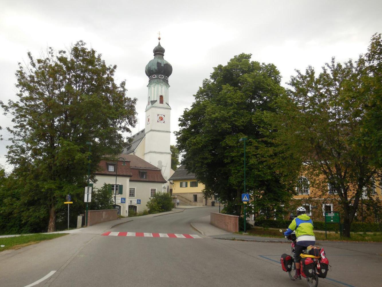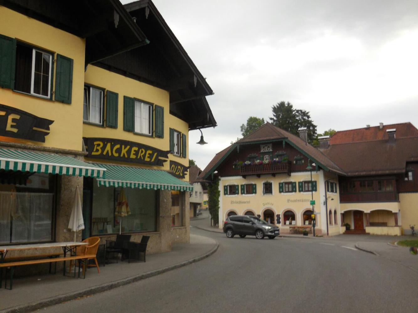 The town of Obertrum was first up for us, as we headed back toward the Salzach to complete our circle tour. Obertrum has a "one and a half onion dome" church, standard for the towns in this region. It also, of course, has at least one bakery. This time there was no need to stop. Yesterday I had gobbled up my half of the pastries we had, but Dodie had sagely conserved some of hers. At breakfast, she shared. It was quite unlike the outcome in the tale of the Grasshopper and the Ant. Dodie is a good ant!