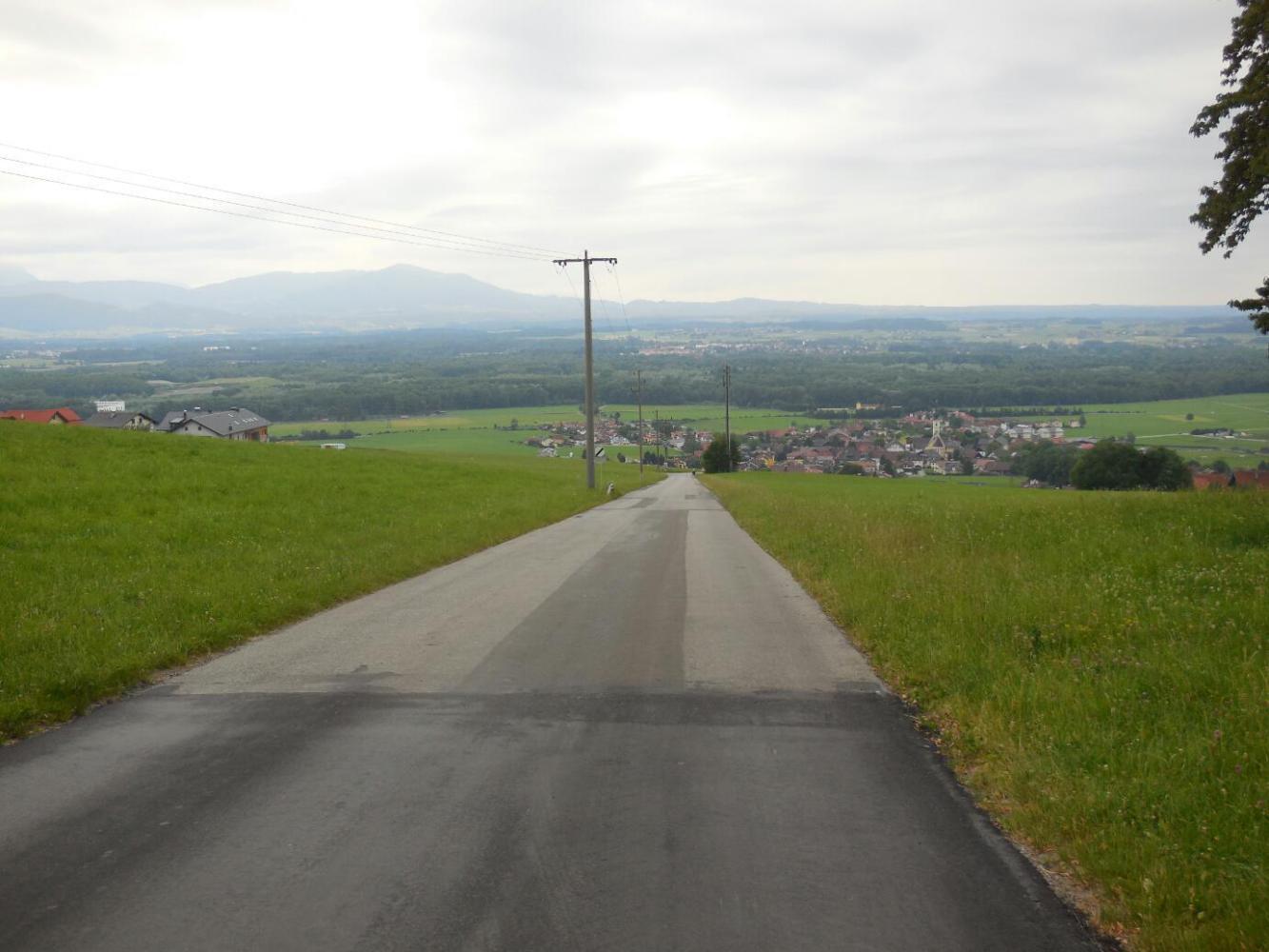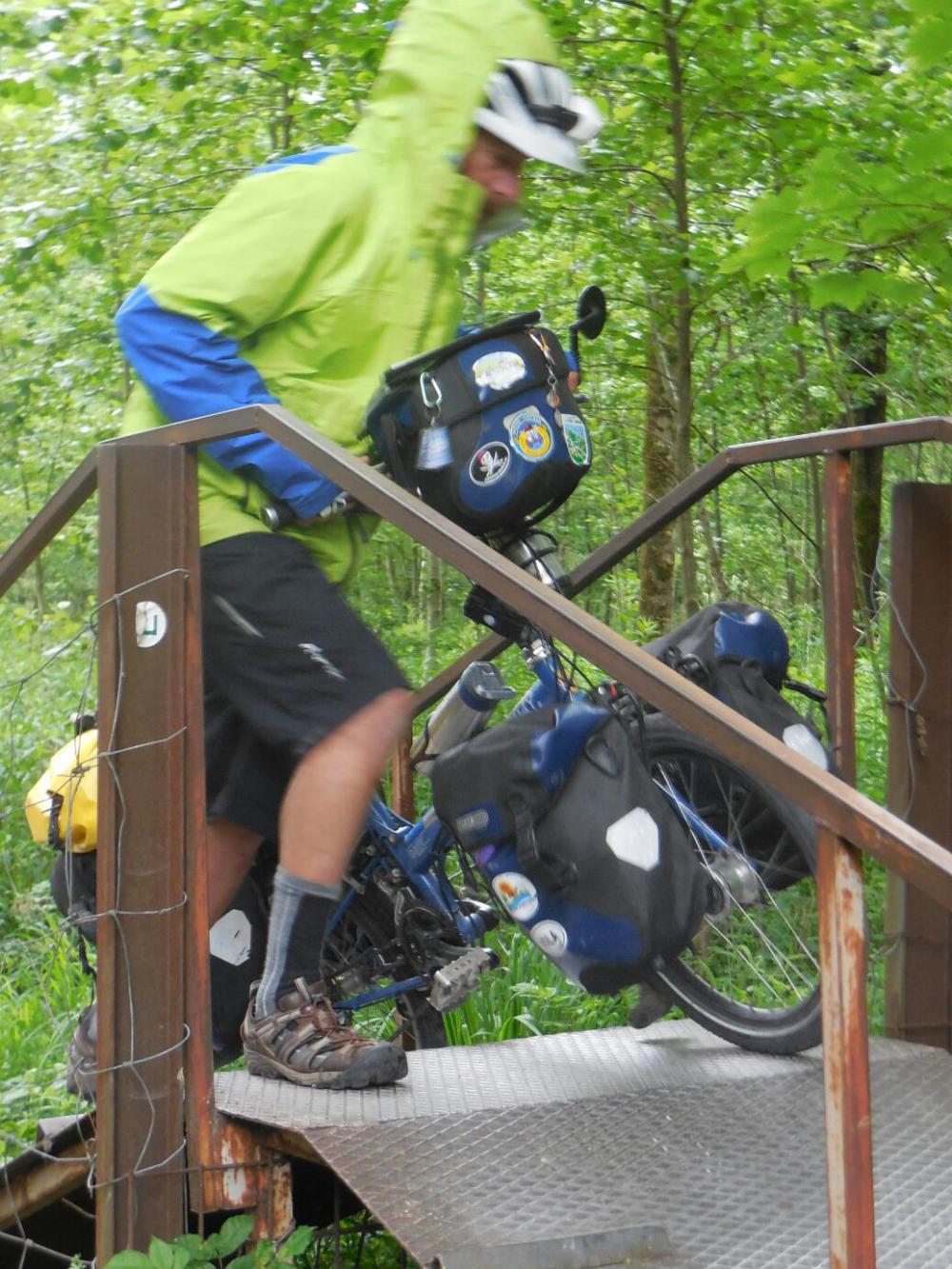 We got to ride down a big hill into Anthering. This hill is well known to anyone who has cycled it in the other direction, such asRichard Hughes, last year. We continued to follow the Mozart Radweg, and this led us into a forest. At the entrance there was a locked gate and a form of style, for bikes to get in. The strange part was that the style was in the form of a steel ramp up and down, very steep. Going over this was almost like lifting the bikes vertically. The metal was patterned, so the great traction needed to push the bikes was there, and over it we went. We were just puzzled about why anyone would have put in such a loaded bicycle unfriendly structure.