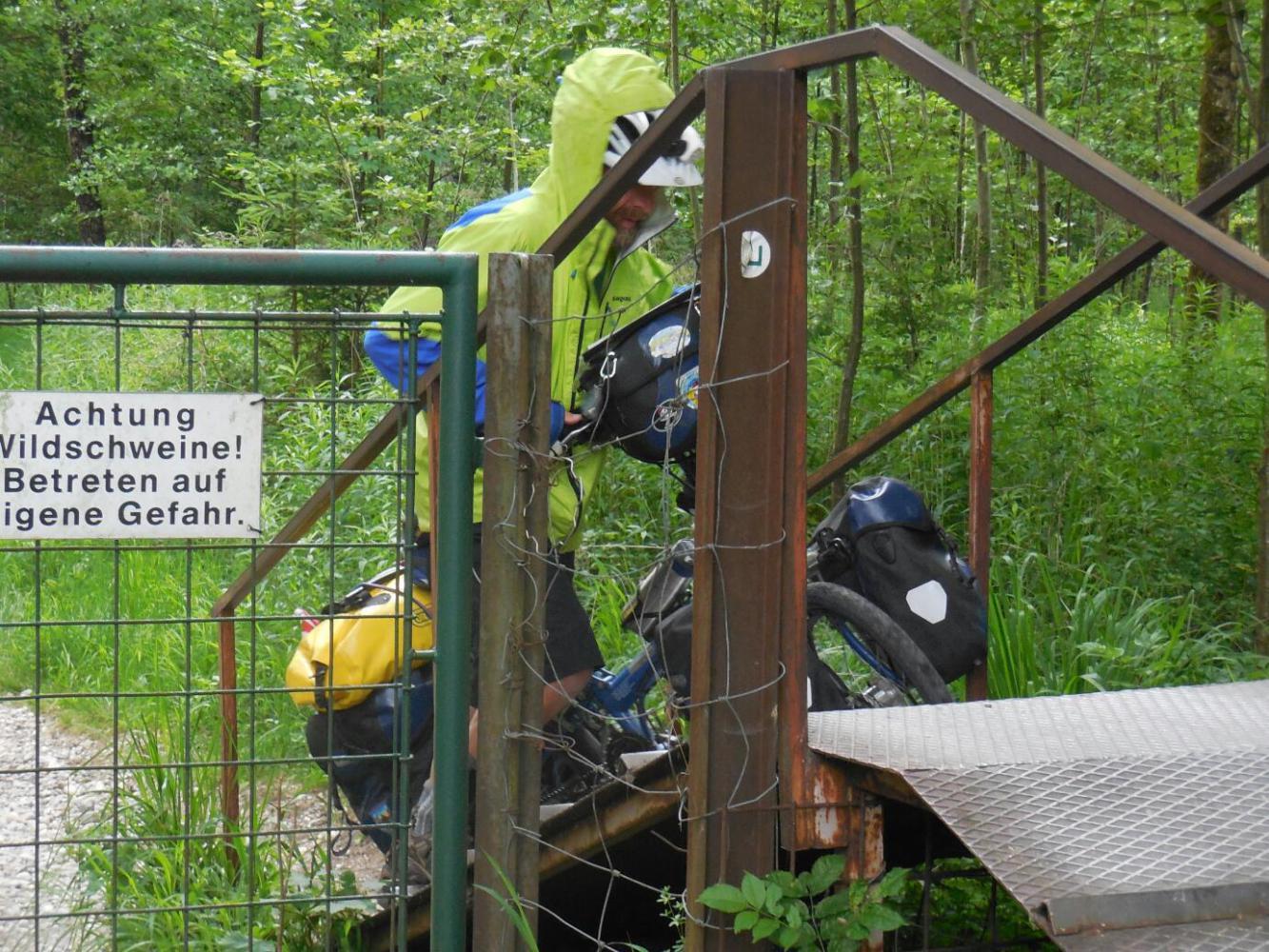 At the other end of the forest there was the matching style for getting out. The only thing, it had rained in the mean time, and the metal plating was now slippery as ice. Somehow we made it over again, and wondered again why this physical test. We got the answer on the other side - a sign that said watch out for wild pigs in the forest, enter at your own risk. We swear there was no such sign for us when we entered. Good thing we did not choose this forest for a wild camp - could have been really wild.