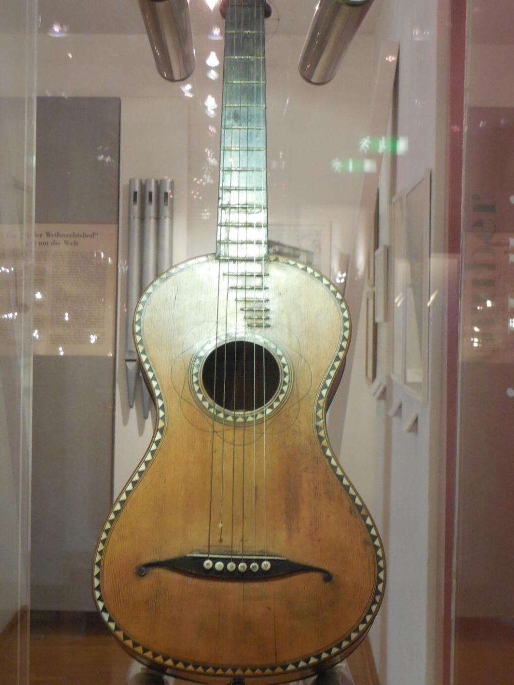 We arrived at the museum just 10 minutes before closing, but the man at the desk let us in, and for a reduced rate. 99 percent of the contents are in German, but we still enjoyed it. There was, in particular, the guitar that Gruber had used for the performance. That would be the same one depicted in the stained glass at the chapel in Oberndorf.
