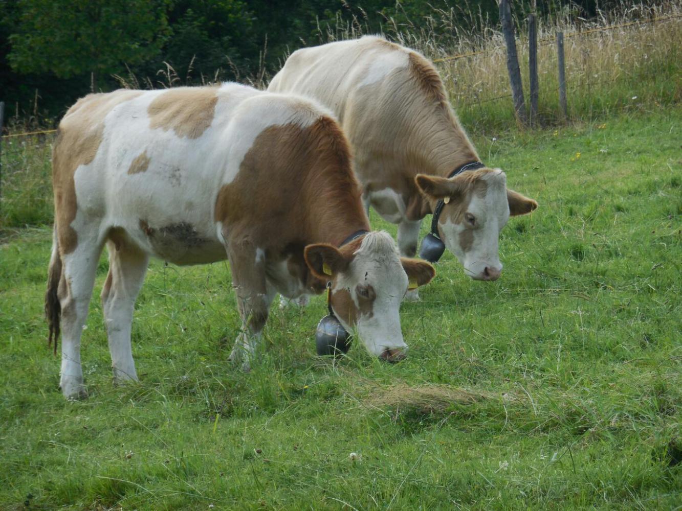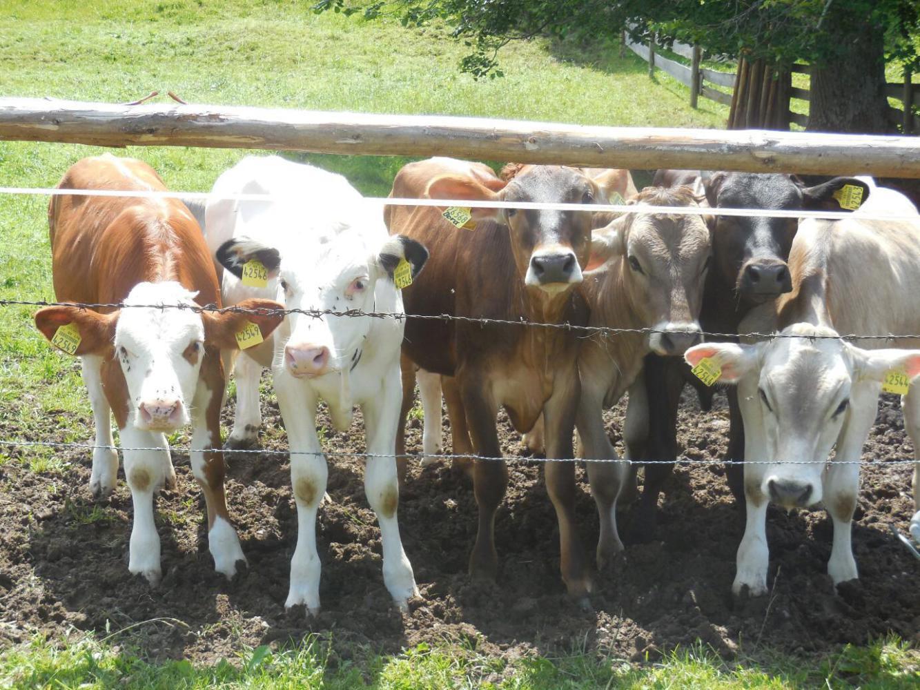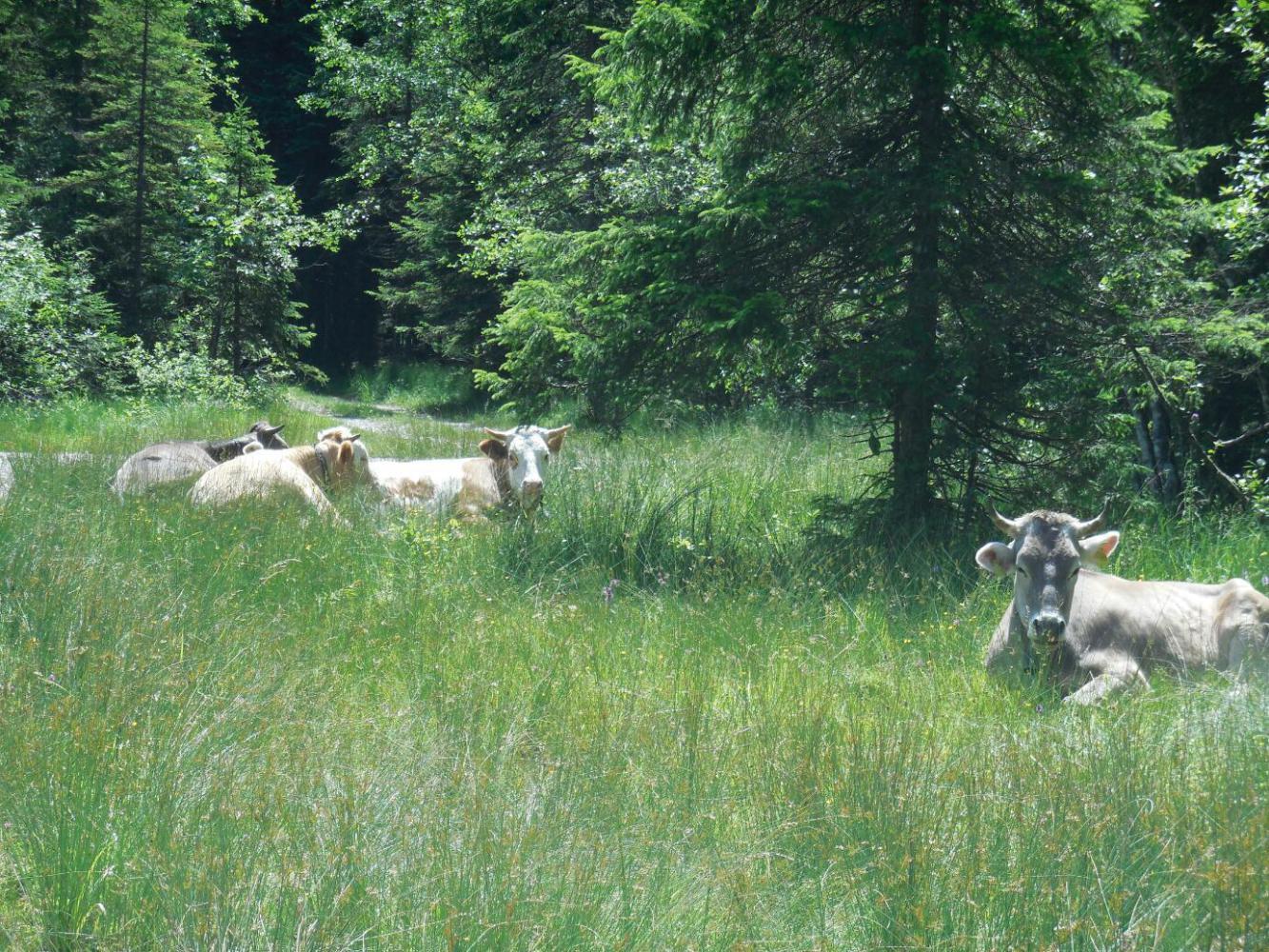 It began as we returned to a bench where we had stopped on the reverse ride, and looked out over the meadows and cows to the high mountains behind. As we sat there admiring the view and eating the stuff we had salvaged from breakfast, four horses galloped up to the fence just behind the bench. They were two very tall mothers and two foals, still nursing. They just settled in to keep us company, the mothers standing very still, and the foals alternating between nursing and seeing what we were up to.