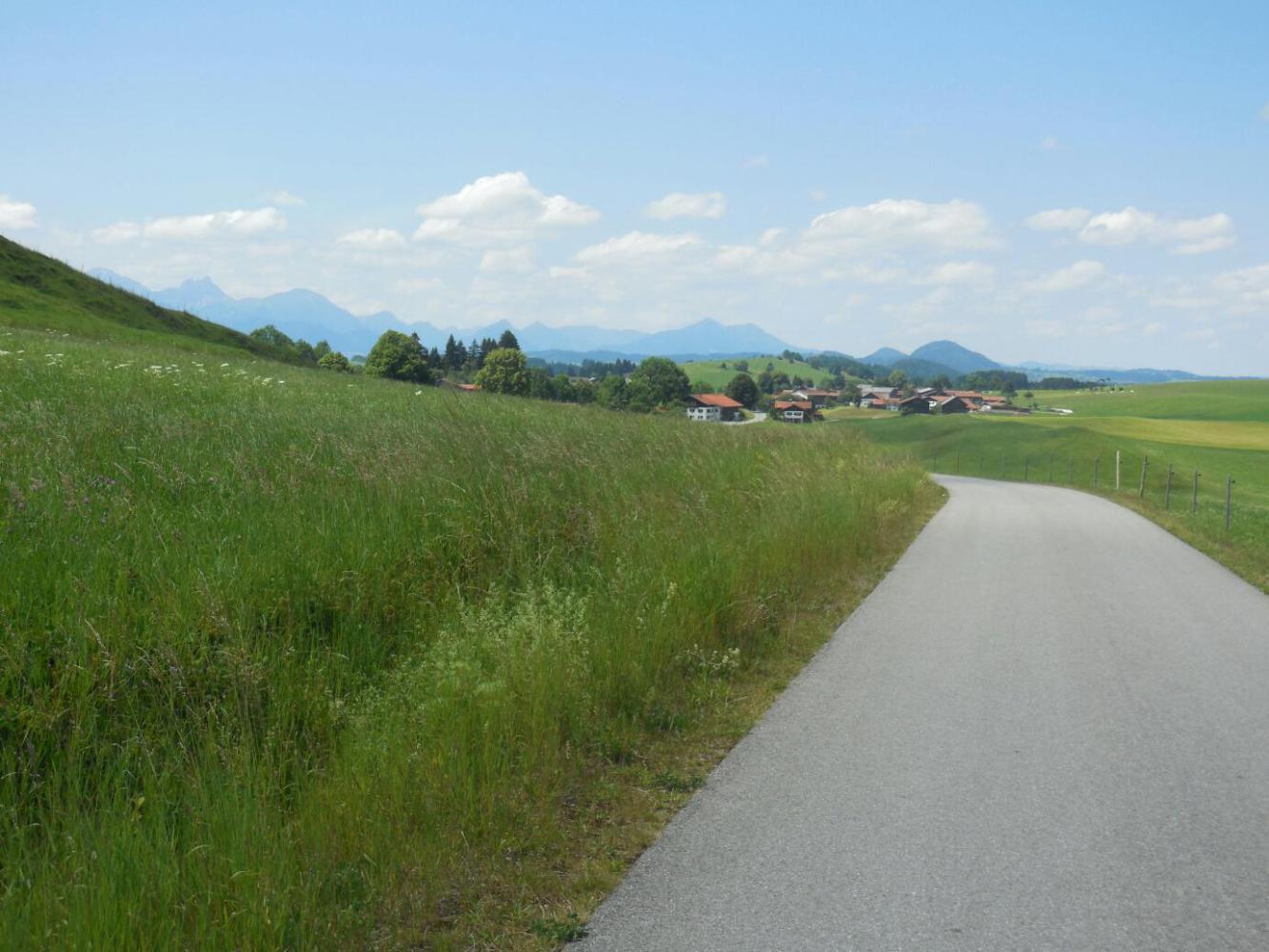 In due course, the mothers took the foals over to a spot in the sun nearby, and put them down for their naps. We took this as our own cue to move on. Our plan was not to return all the way to Fussen, at the south end of the big lake, but to cut across in the north. So we descended south through small villages, until it was time to turn west. All the while we were on nicely paved path or small roadways, with the stunning mountains in the background.