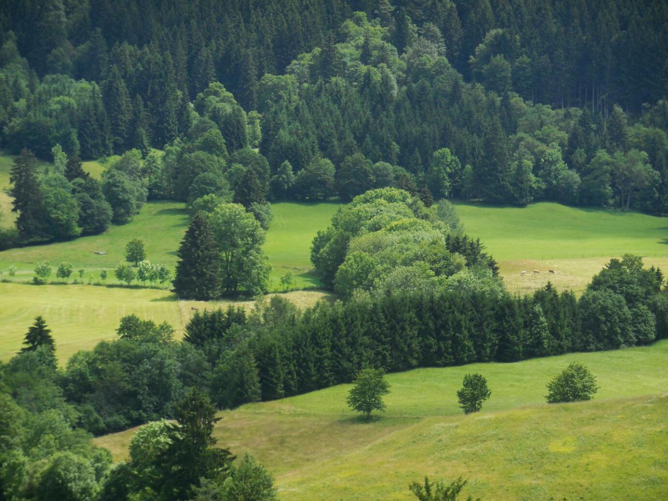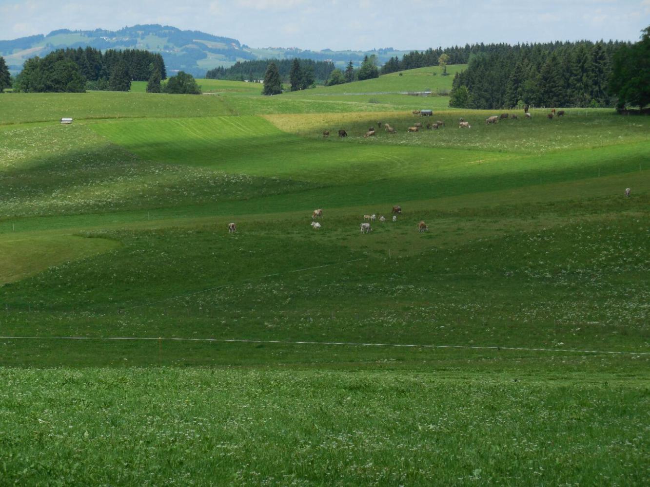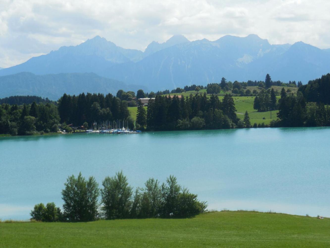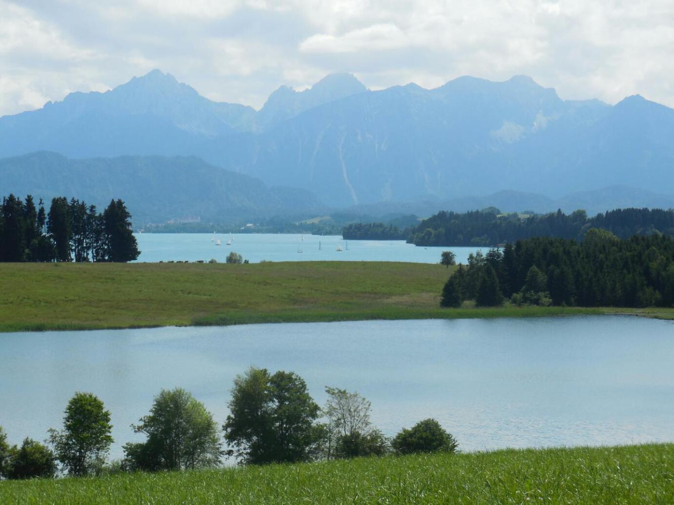 Basically our situation was that the feet of the Ammergau Alps lay between us and the broad valley that contains the large lake (Forgensee), many smaller lakes,, and the town of Fussen. These "feet" of the mountains, while low compared to the height of the peaks, still bear the name Hoher Trauchberg, which itself connotes mountainous heights.
