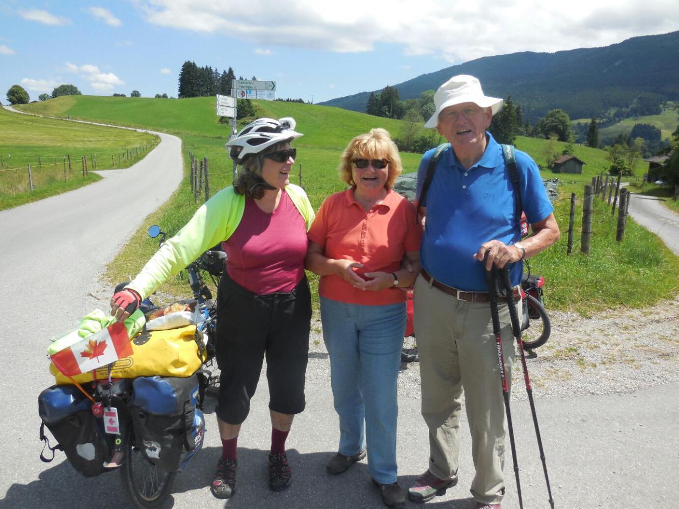We paused at a fork in the road, just to plot our next turns (with our maps and GPS we were having no trouble seeing what they were to be) and a couple sporting nordic walking sticks came up to us. The lady said something in German that we interpreted as an offer of help, but for a change it was in fact that she wanted a peek at our map, to plot a way to the Wieskirche. This was enough to initiate a conversation - or rather two - as I spoke to the man and Dodie spoke to the lady.