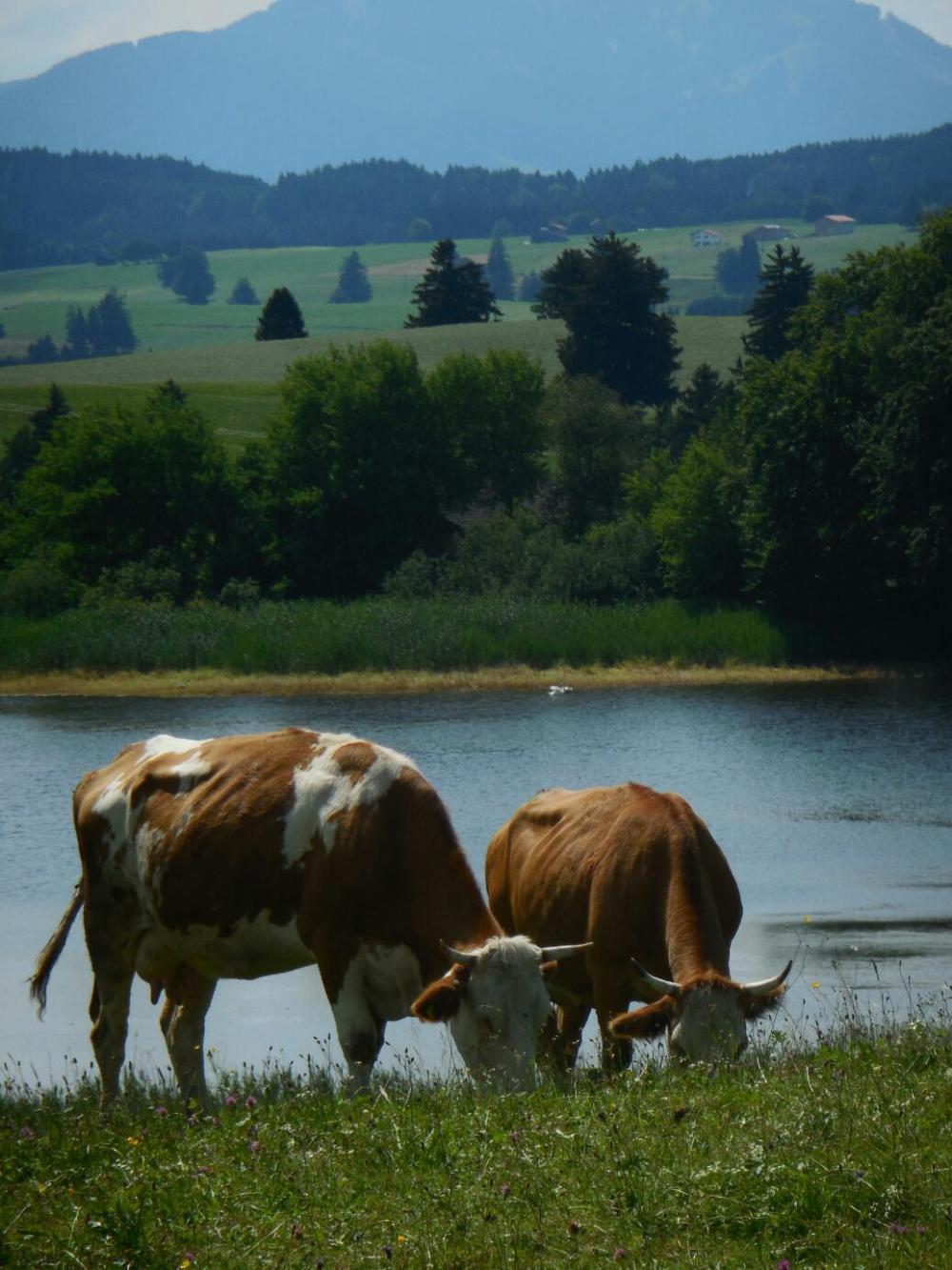 From this point the ride took on an almost surreal quality. The reason was that the scenery went from really pretty all the way up to that pinnacle of beauty that at home we identify only with Bow Lake and Peyto Lake, in Banff Park. In this Bavarian version, we passed by Illaberegsee, a small lake north of the Forgensee. With the green lake in the foreground and the meadows and tall mountains behind, it really was a supreme sight. I am not sure right now if any of my photos will show this properly. I hope so.
