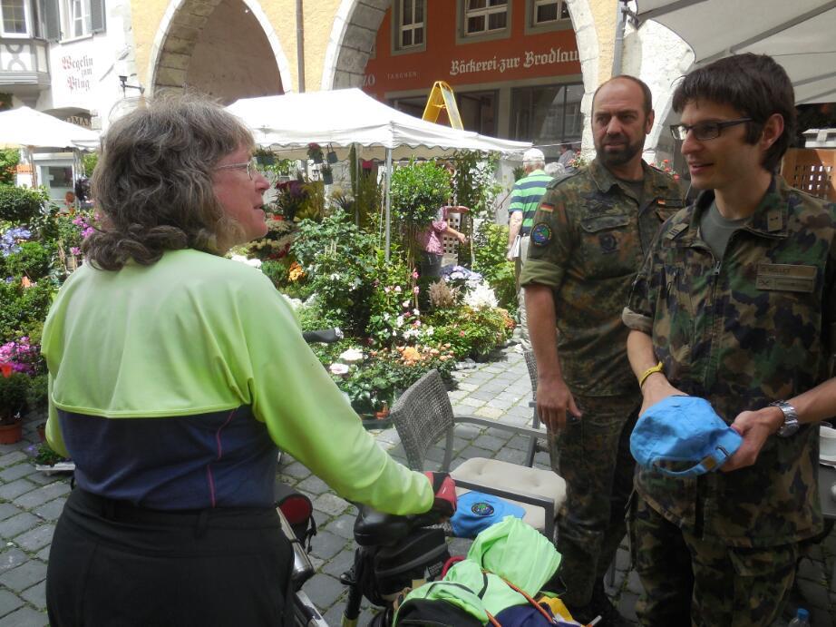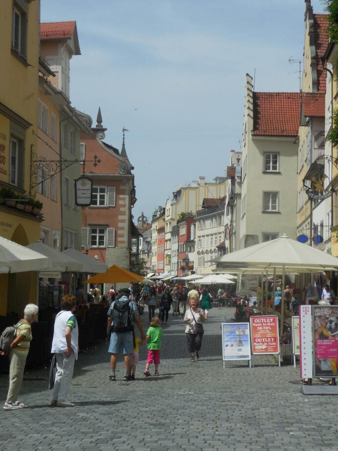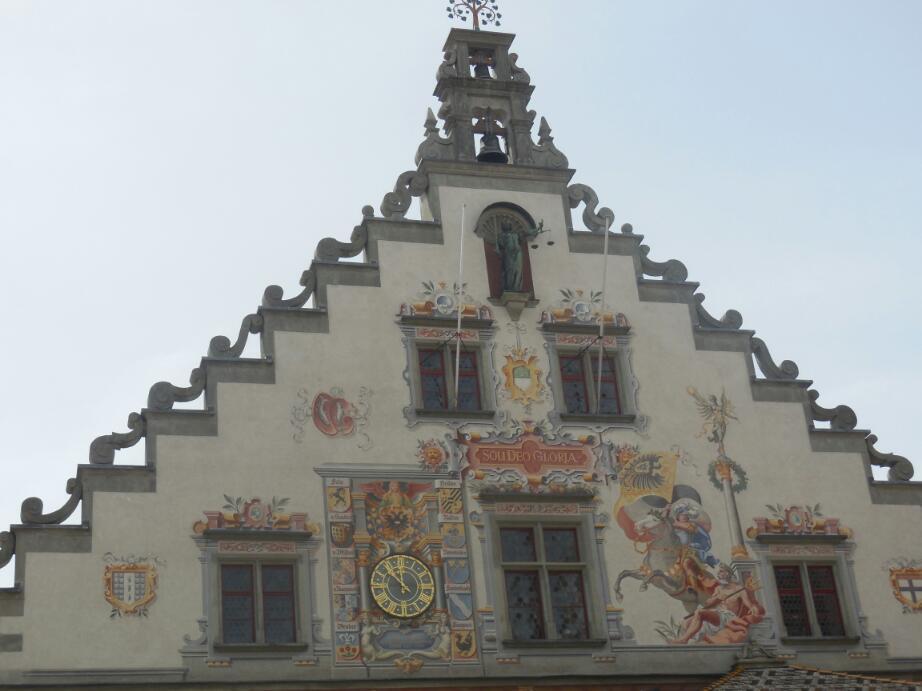 Lindau's rathaus is quite an attraction, with its painted facade. The building was built between 1422 and 1436, but the facade was refurbished in the 1970's. The pedestrian street was fun, as always, but not really special among pedestrian streets we have walked. On the street, though, we noticed several groups of people in military uniforms. We could not quite figure out which army they were from, since various country names seemed to pop up on their insignia. Finally, when we had taken a set at an eis cafe (to share a diet chocolate ice cream sundae) we looked across the narrow street at about a dozen of these folks seated at the adjacent cafe. I brashly went over and waded in among them, to ask what they were all about. It turned out that they were in fact from a variety of countries, mainly Switzerland and Germany but with even Sri Lankans or Malaysians included. They were here on a training course with the U.N. for peacekeepers. The fellow closest to me was in fact from Switzerland, and I asked him a pile of questions. Some of what Iearned was that: