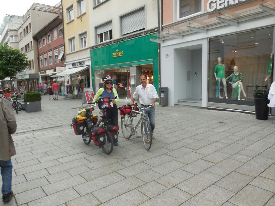 We had another crack at phoning our friend Bernie, in Bregenz. We had met Bernie two years ago when he found us looking lost at an intersection in the town, and had taken us home to his place in the next town, Hochst. Bernie had invited us to come back, but our attempts to call him had failed. Finally we succeeded, by guessing that I had written down one "1" too many at the end of the number. Bernie is a mechanical engineering teacher, and luckily today turned out to be the last day of school. So he cycled from school to meet us at a restaurant by the Bregenz boat harbour.