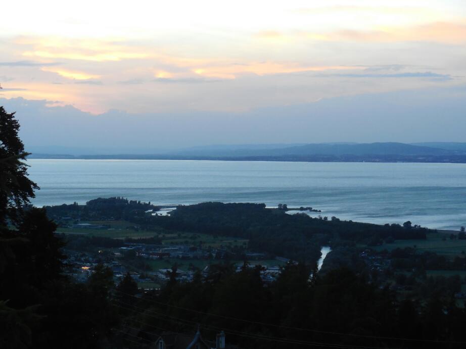 Delia had some suppere ready for us, and after we settled down to watch Germany defeat France in the World Cup. Then it was time to start writing this blog. I was doing it, when Bernie suddenly said "Hey, we could drive to Switzerland for an overview of the Lake". "What, at 8:45?" I said. "Sure!".