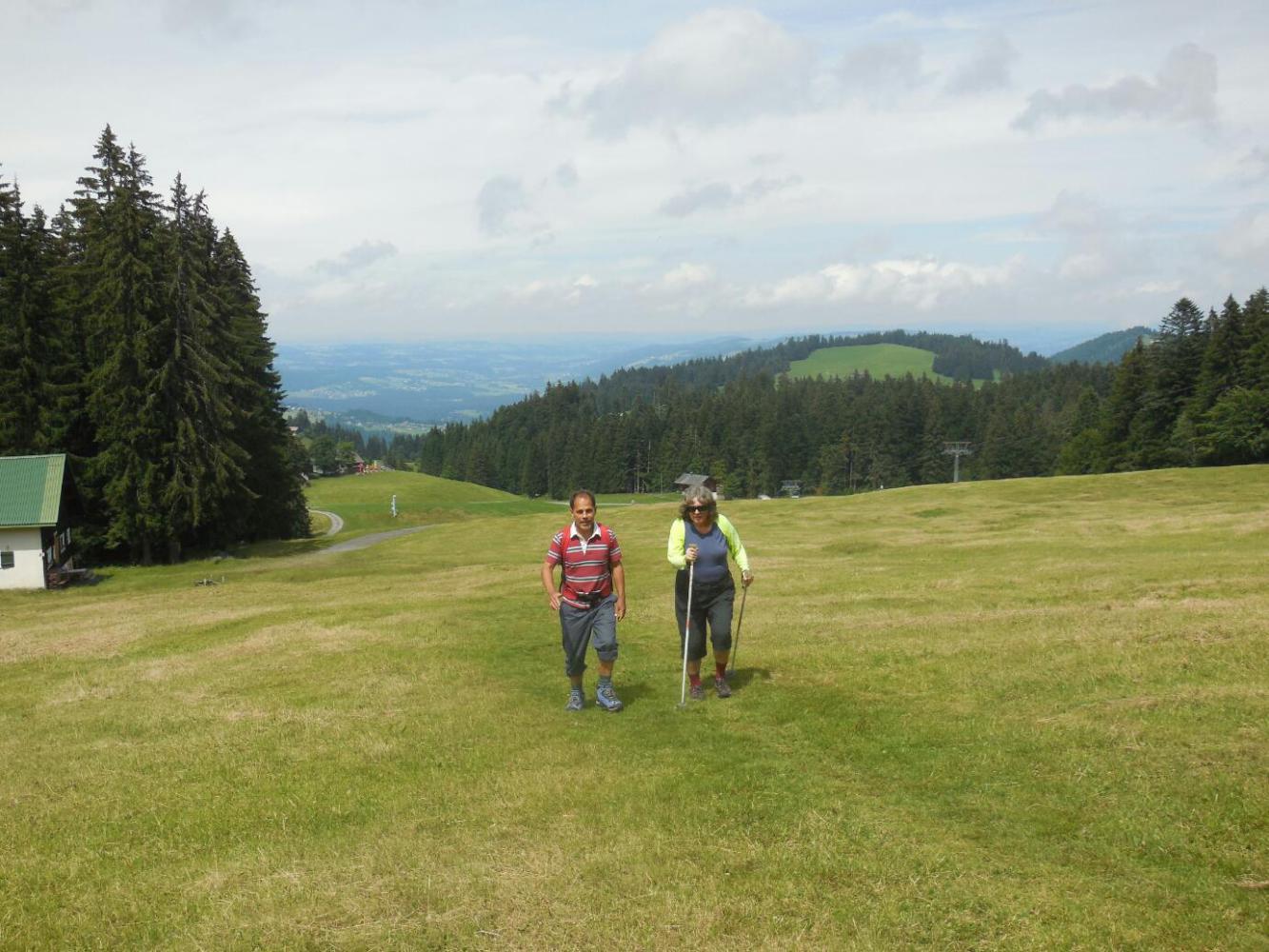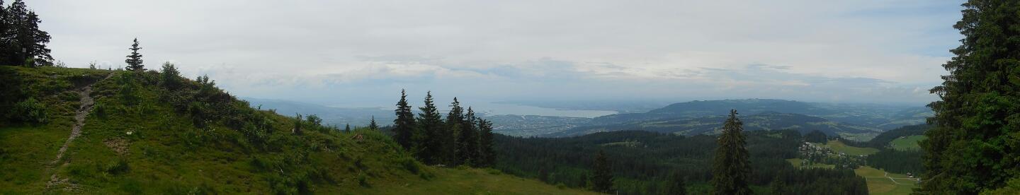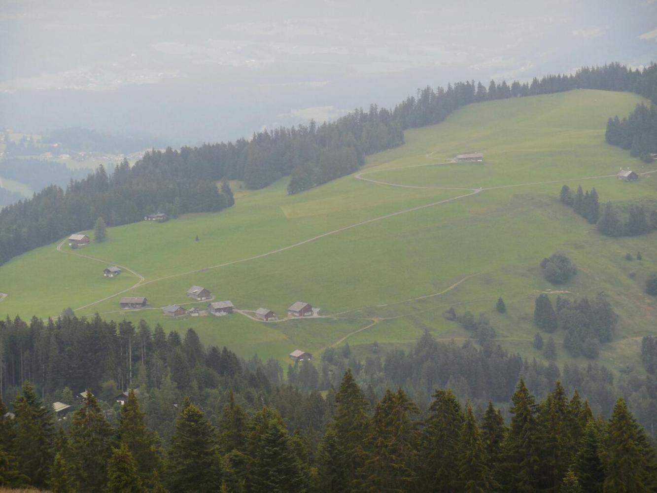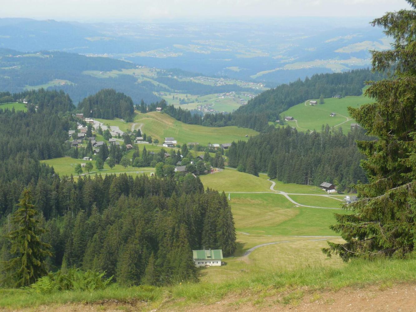 Our clever ploy of hiding out in the Rotes Haus gave the rain a chance to stop, so now we completed our drive up to the base of the mountain. This was not exactly a mountain in the sense of Mont Blanc or anything. It was called the Hochalpele - high alm. This was essentially a ski hill, in that a number of lifts went to the top. But it was unique because it afforded views down to the Lake, to Bregenz, to the area near Hochst where the Rhine enters the Lake, and then back around to the south, where there are numerous villages and high farms among the Alm.
