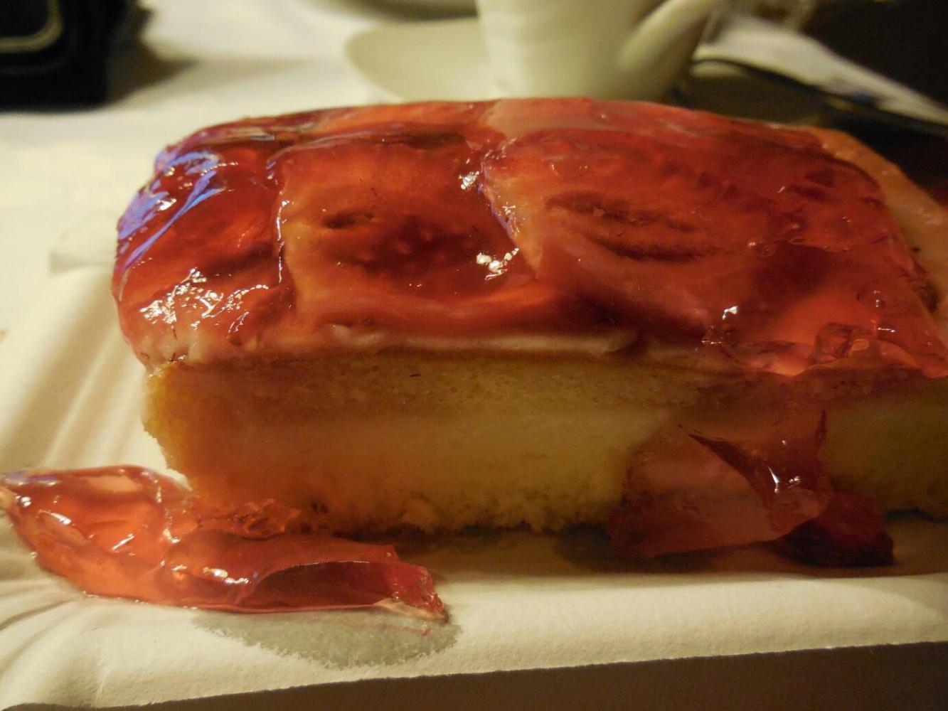 Back home, we had way more food than we have become used to seeing. This included great chocolate cake made by Bernie's Mom, and also an Erdbeeren Schnitte that it looked like Bernie had gone out specially to source this morning. This one was the best yet - with the feature I have been looking for - a qwark layer. In this case there was a cake base, the qwark layer, another cake layer, then a thin coating of something else, before the strawberries and gelatin. The whole thing was very moist and yummy. Actually, I have eaten so much cake today it's almost like somebody is trying to train me out of it. Tomorrow, though, we will leave this lovely house and family, and go back to "limping" from bakery to bakery!