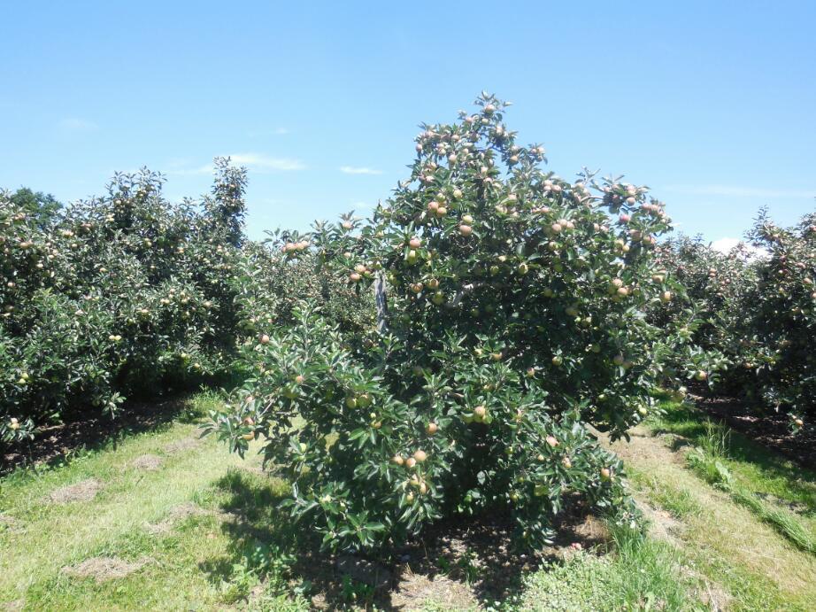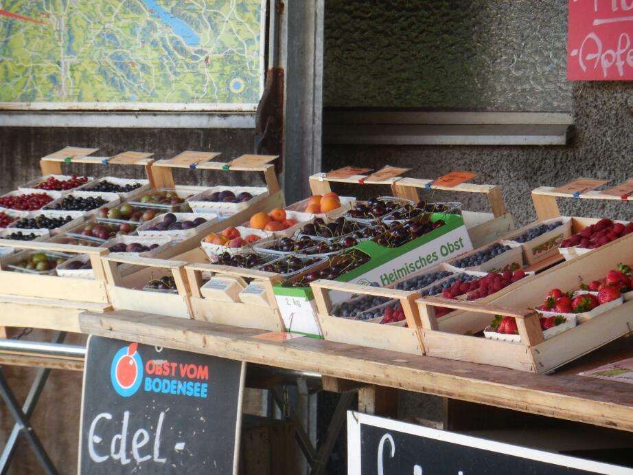 In and around the housing there were actually some open areas, and these were devoted to fruit production. This is quite a warm area, as we could see by the fact that Delia's eggplants are almost ready. So there are a large number of intensively maintained apple, pear, and cherry orchards. We bought some terrific cherries at a roadside stand, and came upon quite a few along the way. We remember from last year, even larger orchards up the opposite, Swiss side of the lake.