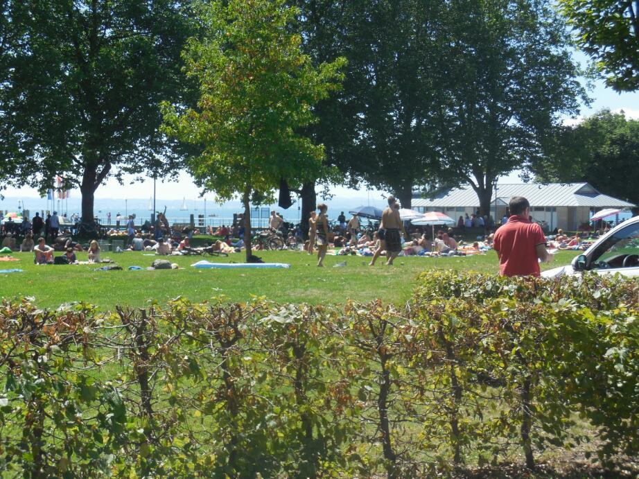 We came to the Bregenz harbour area, where we had made our rendez-vous with Bernie two days ago, and had sat with him in the Hafen Restaurant. Already we felt nostalgic about our time there. We continued back around the lake, passing people all along who were enjoying the lake accesses.Most of these were somewhat informal, but we did pass at least one area that was more formally a "beach" and offered a lot of parking.