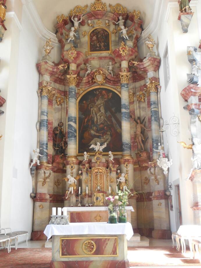 There was also one place right along the way that had some souvenir stores, and a church, anyway, and that was Langenargen. The church gave us a chance to get out of the sun, and it did have a nice interior, with lots of blue marble. We were interested to observe two under ten year old kids who were there at the same time as us, to see how they would behave and what they would be interested in. Apart from going up into the altar area (which one genreally does not do), the kids were well behaved, and seemed to be absorbing the ambiance, the same as everyone else.They might have preferred a playground, but they seemed ok with being brought inside this building.