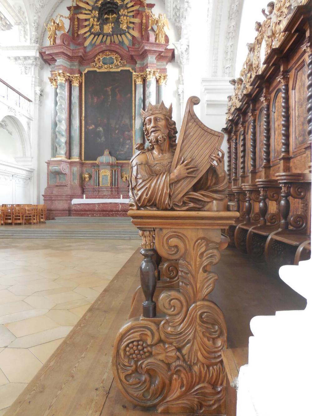 The schlosskirche, at the other end of town was also heavily damaged by air attacks. An offer to construct a temporary protective roof from the Duke Philippe Albrecht of Wurtemburg was turned down by the nazis, and after the war a shortage of building materials hindered work, resulting in rapid deterioration. The church was saved when the Protestant community in St Gallen came up with roofing tiles. What we saw today was not the ebullient ceiling painting of a baroque catholic church, but a more subdued treatment in plaster decoration. Still, the ceilings and church in general were very impressive. When we stepped in, someone was playing the organ - maybe just practicing. Visiting a church-is always much better if the organ is playing.