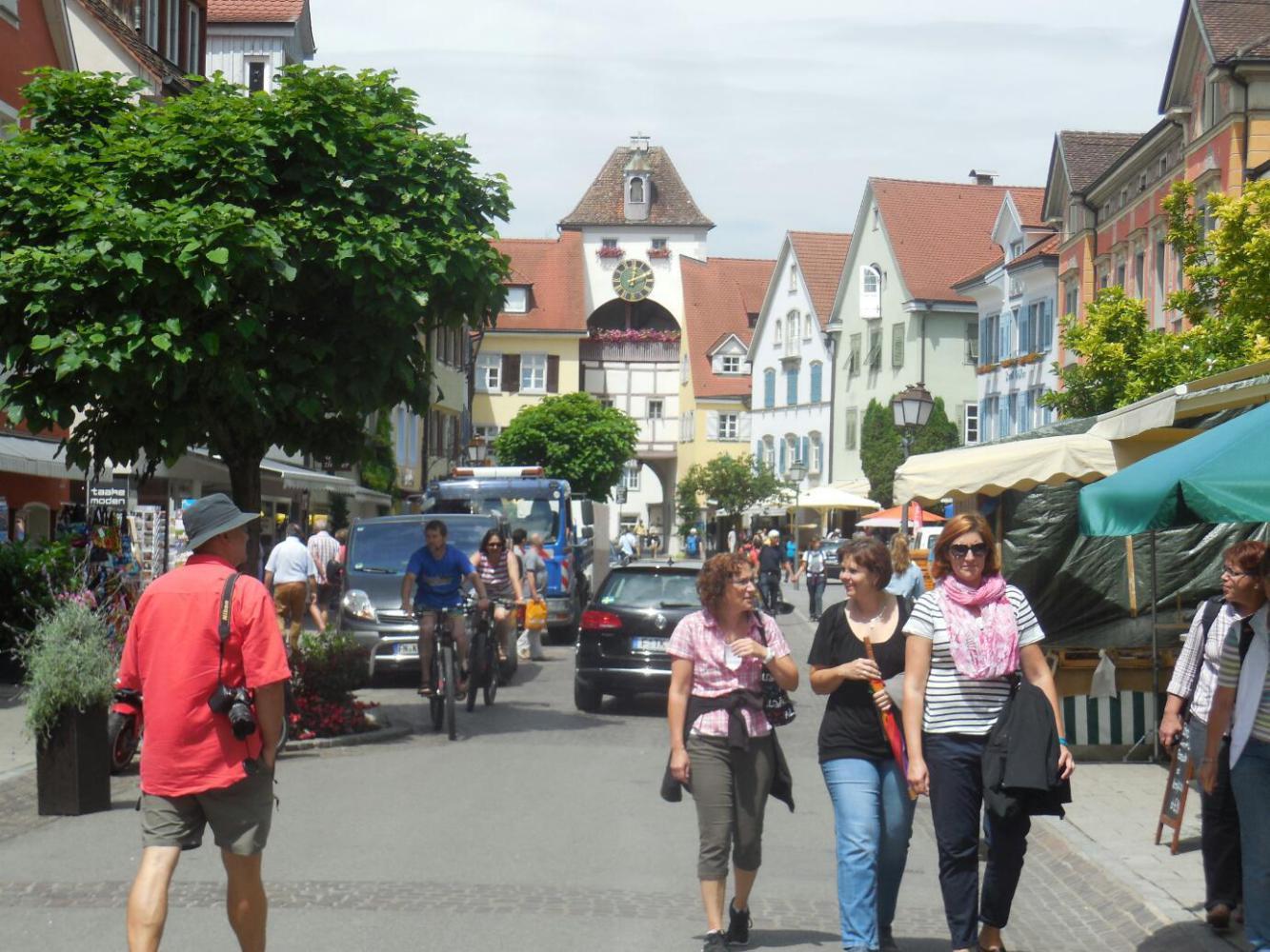 Meersburg also had schlosses and vineyards, plus a main ferry over to Konstanz. It was souvenir shops on the main street that caught our attention, though. We found cycling themed tee shirts that also say Bodensee and Meersburg, all in suitable grandkid sizes! Looking at the safe cycle path (today there was little or no on road cycling) and the swimming spots on one side, ice cream shops on the other, we had begun to talk more about bring some or all of the kids here some year soon. Well, they have already got the tee shirt!