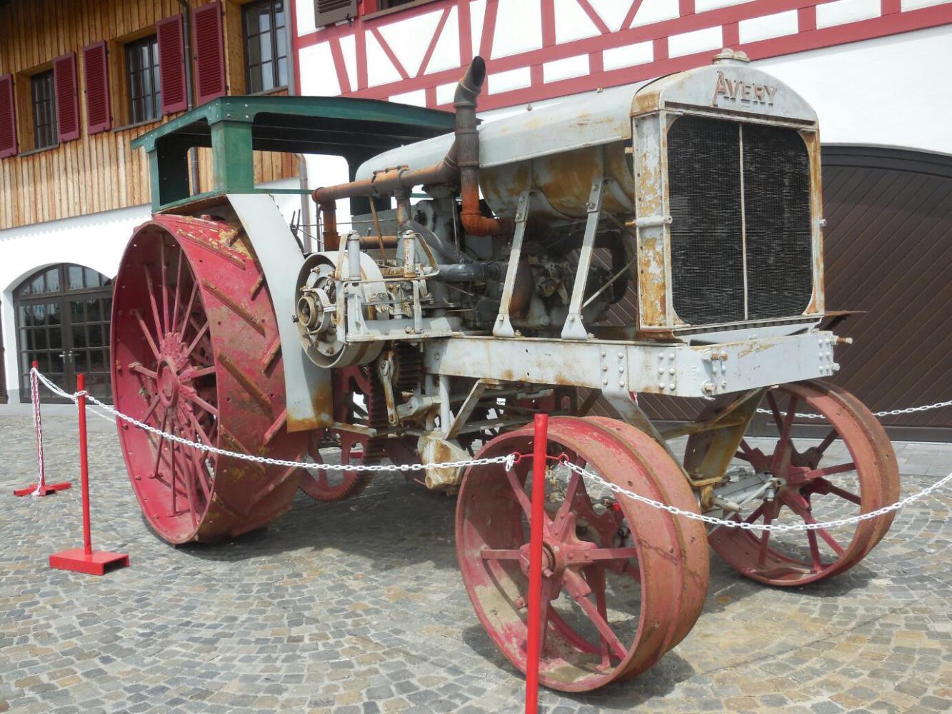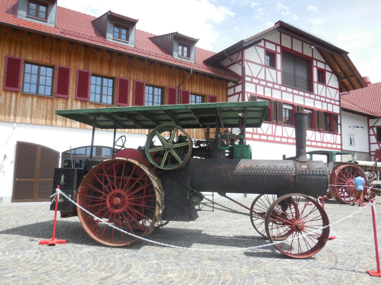 Dodie was very intrigued by a sort of museum - reconstruction of houses that might have been used here by stone age and bronze age people, whose dwellings were on stilts in the lake. The attraction that illustrates this is in Uhldingen, and we went to have a look at it. Another 9 euro admission fee put us off, but mainly we found that the visit is guided and that German is the only language. We were sorry to let this one go, but did cycle slowly off to our next thing. The next thing was the tractor museum. There were a lot of signs for it all around, including large illustrations on the backs of busses. We followed the signs, and these led us on, through Muhlhofen, and beyond. We were directed up hills steep enough to need pushing the bikes. Finally arriving, we found another 9 euro admission. These admission fees, which amount to about $30 for the two of us for each attraction would not totally break the budget, but psychologically there are about double what we expect or would accept. So with a spin through the gift shop, and a sniff at the restaurant (which wanted 5.50 per slice of Schwartzwald cake) down the hill we swept again.