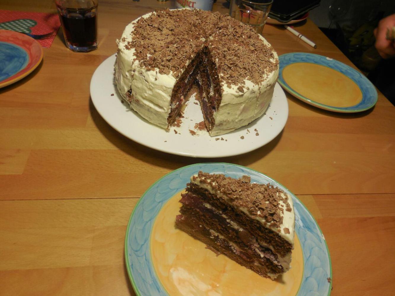 Jurgen, meanwhile, had made a Blackforest cake - a specialty with him, based on a recipe and training from his mother. This had a base made with ground nuts, moist chocolate cake layers, and the critical cherries and whipped cream. All in all, it was a tour de force and one that might be hard to beat, even in the actual Black Forest.