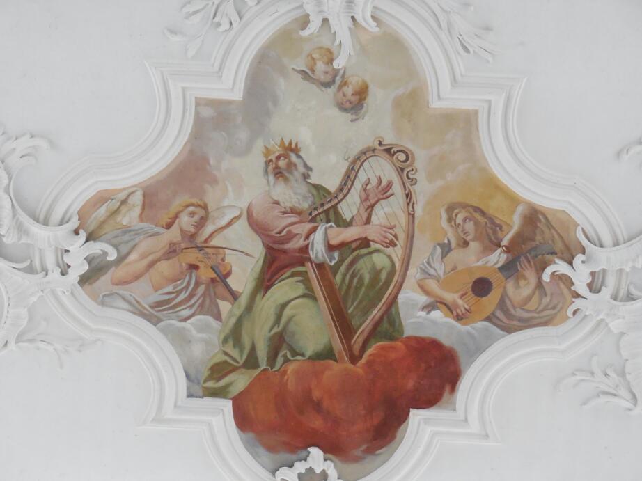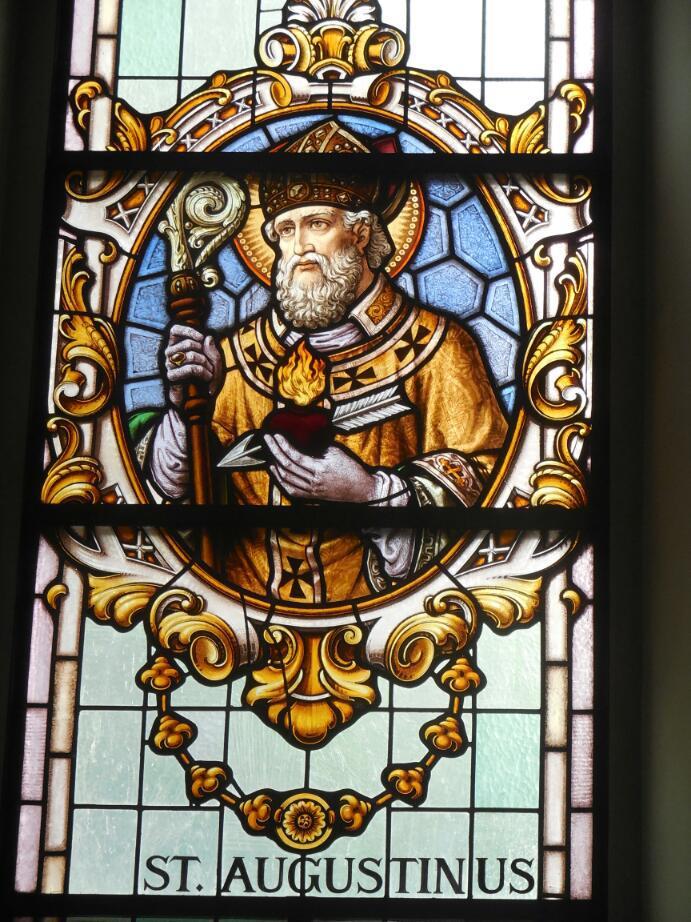 The church in Allensbach was pretty basic inside, in an ornate sort of way. That is, it had only three ornate "alter units" one on each side and one in the centre. Each unit is pretty complex, but there were clearly just the three bits. The stained glass, too, was on a manageable scale. One window, made in 1909, depicted St. Augustine. This brought to mind the Bob Dylan song, which ends: