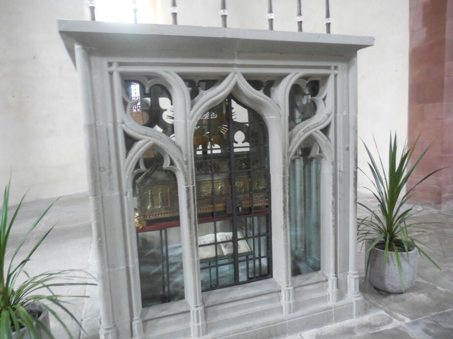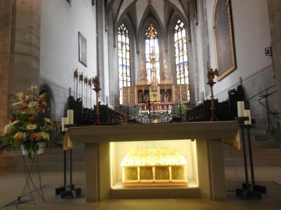 The Radolfzell munster, more than some others, it seems, is into reliquaries. Reliquaries are (were) a big deal, because (as we learned from Brother Cadfael) having the right relics could substantially enhance the image, pilgrimages, and revenues of a church or abbey. From the point of view of the public, seeing or even touching a relic could work miracles, and help with existential fears, mental anguish, or physical threats.