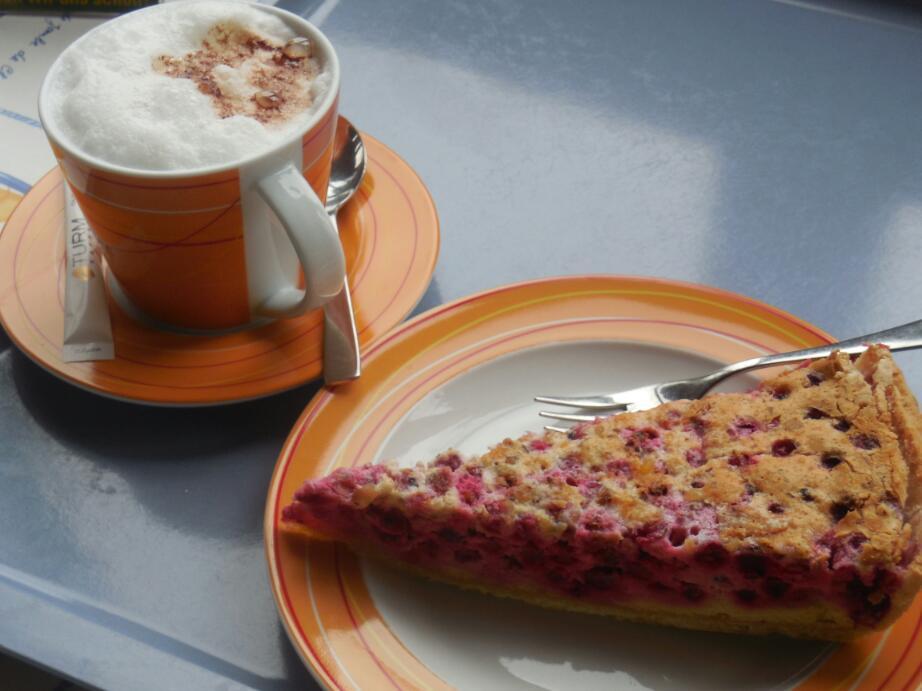 We are writing this from the little harbour on Reichenau, waiting for the ferry over to where we hope the bike path will not be closed, so we can carry on to Radolfzell. Here in the cafe, they have a great looking erdbeer schnitte, with a cheese layer! But, when it came to the crunch, I could not resist the even better looking johanisbeer kuchen (red currant coffee cake). So many pastries, so little time!