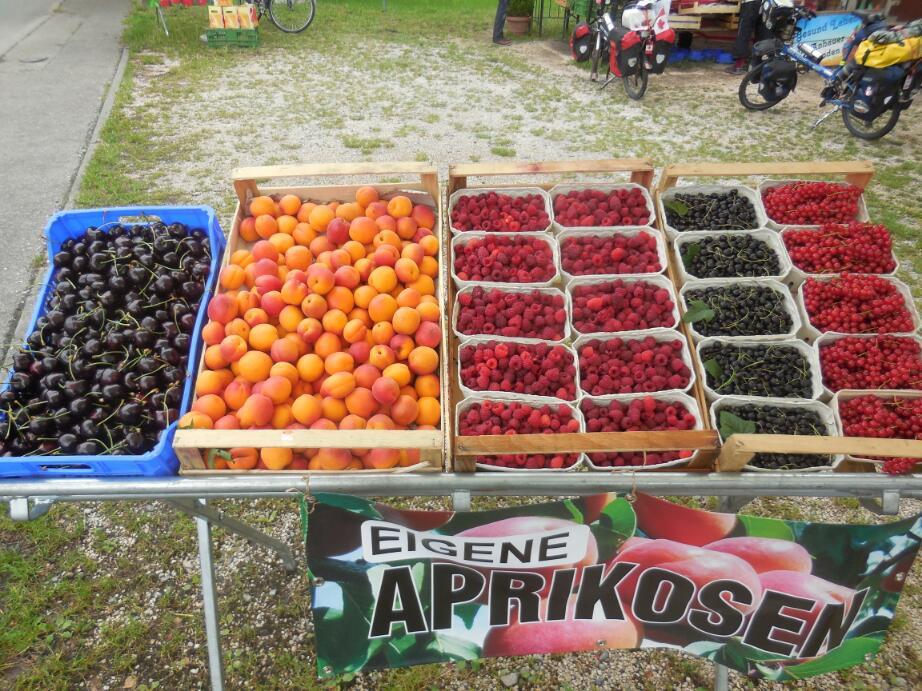 Across from Reichenau, our little ferry landed at Allensbach. Allensbach is a small town, but it did feature a picturesque church, with classic onion dome, a small farmers' market in progress, and a variety of fruit stands. The fruit stands are now popping up all along the lakeside, and right now are offering many kinds of berries, and really large and luscious cherries, plus apricots. The apricots are Dodie's favourite, and she claims to be able to eat an unlimited number of them without distress.