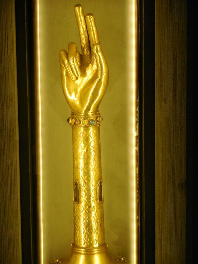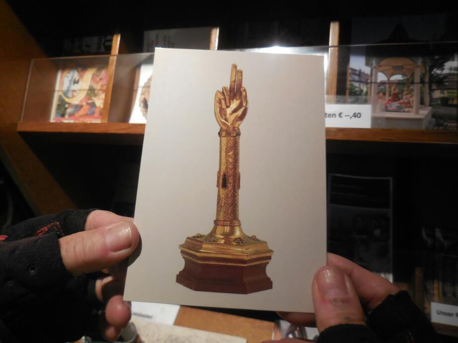 So, at Radolfzell, they have the grave of Radolf, the founder of the church, and the town that grew around it. However, they also have three other saints: Senesius, Theopont, and Zeno. These are known as the "landlords" (hausherren) of the place. Since 1542 these relics have been the focus of a solemn procession through the town. This is the start of a traditional festival known as the Hausherrenfest. Anyway, in the church are these gold boxesand suchlike, containing the precious relics. An eloquent and weird one is a gold hand - containing the relic of St Ursula.