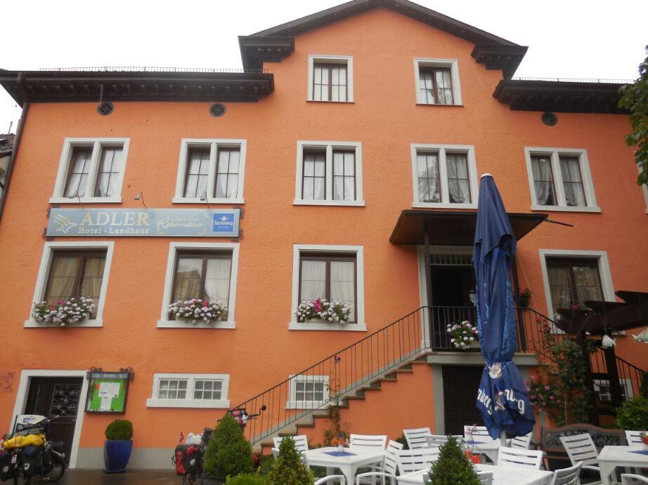 Speaking of weather, it rained lightly all day, and the forecast calls for another week of basically rain. This really puts a clamp on camping, since setting up and/or taking down the tent in the rain is a real bug. With this in mind, we knew we would seek out a guesthouse tonight. In the small town of Wangen, which is 5 km from the major tourist site of Stein am Rhein, we decided to stop, though we had not gonevery far at all. Our thinking was that in Stein, which is in Switzerland to boot, prices would likely be very high. We went to the camping in Wangen and asked about a room or a covered beer tent. They offered us a wohnmobile (camper) for 50 euros, but instead we went over to the Guesthouse Adler, 58 euros with breakfast.